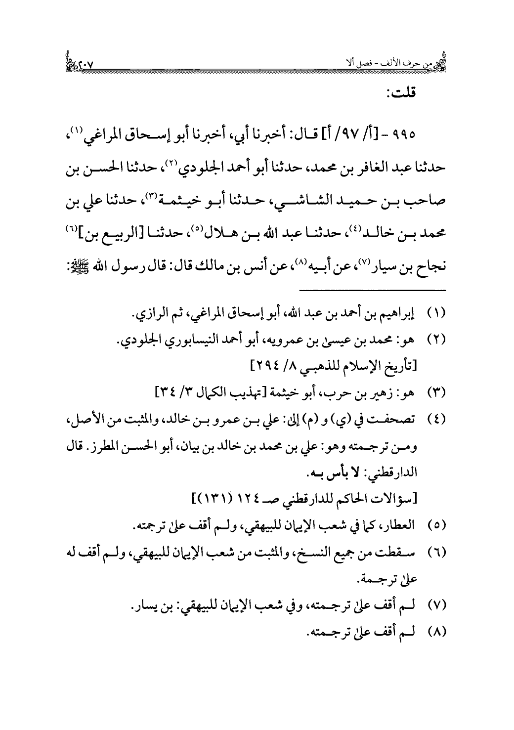 ٩٩٥ - قال: أخبرنا أبي، أخبرنا أبو إسحاق المراغي (¬١)، حدثنا عبد الغافر بن محمد، حدثنا أبو أحمد الجلودي (¬٢)، حدثنا الحسن بن صاحب بن حميد الشاشي، حدثنا أبو خيثمة (¬٣)، حدثنا علي بن محمد بن خالد (¬٤)، حدثنا عبد الله بن هلال (¬٥)، حدثنا [الربيع بن] (¬٦) نجاح بن سيار (¬٧)، عن أبيه (¬٨)، عن أنس بن مالك قال: قال رسول الله - صلى الله عليه وسلم -: