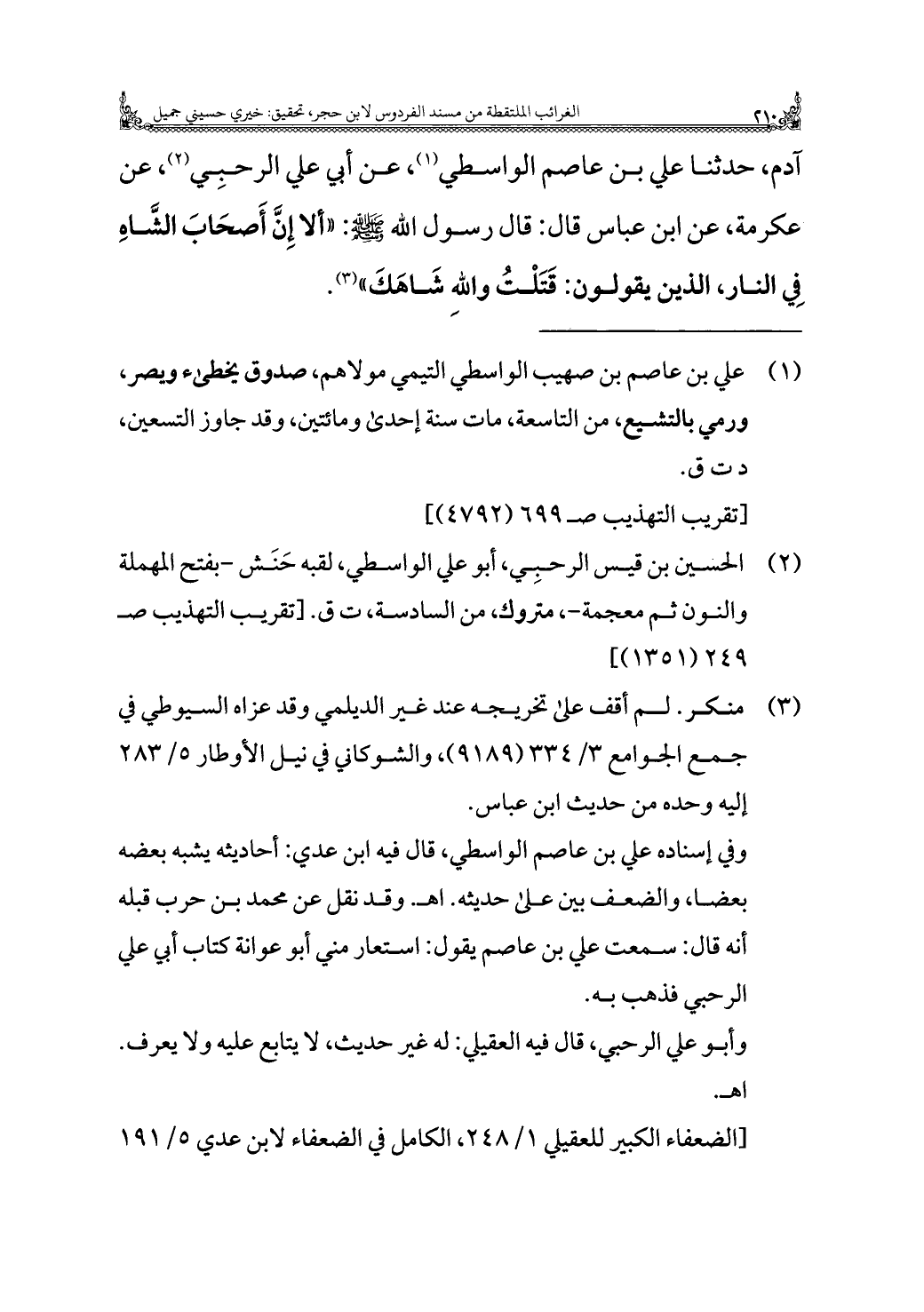 آدم، حدثنا علي بن عاصم الواسطي (¬١)، عن أبي علي الرحبِي (¬٢)، عن عكرمة، عن ابن عباس قال: قال رسول الله - صلى الله عليه وسلم -: "ألا إِنَّ أَصحَابَ الشَّاهِ فِي النار، الذين يقولون: قَتَلْتُ واللهِ شَاهَكَ" (¬٣).