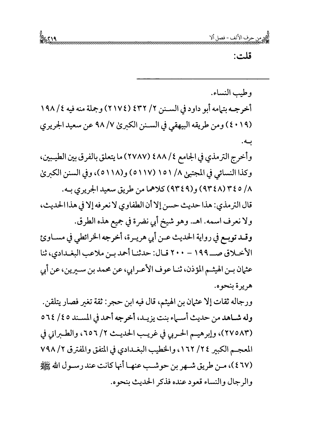 وأخرج الترمذي في الجامع ٤/ ٤٨٨ (٢٧٨٧) ما يتعلق بالفرق بين الطيبين، وكذا النسائي في المجتبئ ٨/ ١٥١ (٥١١٧) و (٥١١٨)، وفي السنن الكبرى ٨/ ٣٤٥ (٩٣٤٨) و (٩٣٤٩) كلاهما من طريق سعيد الجريري به.