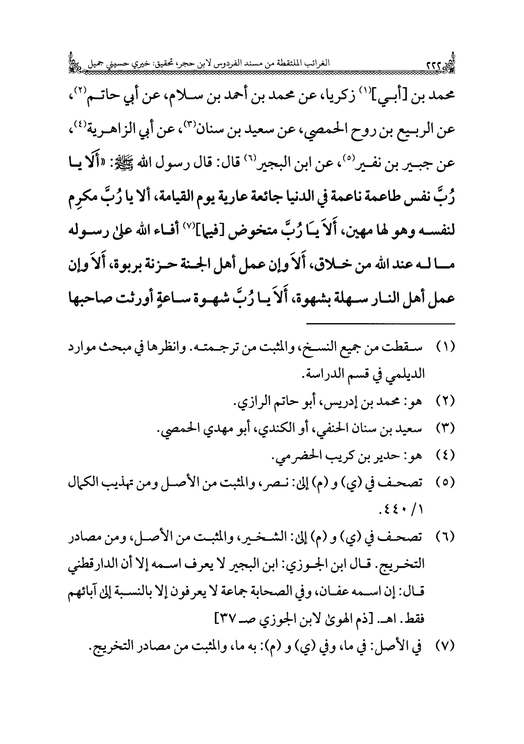 محمد بن [أبي] (¬١) زكريا، عن محمد بن أحمد بن سلام، عن أبي حاتم (¬٢)، عن الربيع بن روح الحمصى، عن سعيد بن سنان (¬٣)، عن أبي الزاهرية (¬٤)، عن جبير بن نفير (¬٥)، عن ابن البجير (¬٦) قال: قال رسول الله - صلى الله عليه وسلم -: "أَلا يا رُبَّ نفس طاعمة ناعمة في الدنيا جائعة عارية يوم القيامة، ألا يا رُبَّ مكرِم لنفسه وهو لها مهين، أَلَا يَا رُبَّ متخوض [فيما] (¬٧) أفاء الله على رسوله ما له عند الله من خلاق، أَلَا وإن عمل أهل الجنة حزنة بربوة، أَلَا وإن عمل أهل النار سهلة بشهوة، أَلَا يا رُب شهوة ساعةٍ أورثت صاحبها