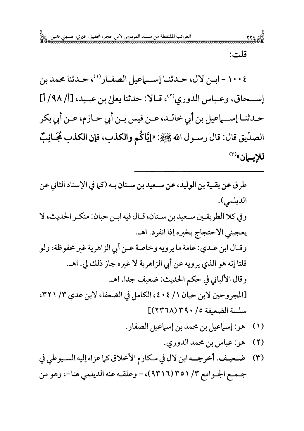 ١٠٠٤ - ابن لال، حدثنا إسماعيل الصفار (¬١)، حدثنا محمد بن إسحاق، وعباس الدوري (¬٢)، قالا: حدثنا يعلى بن عبيد، حدثنا إسماعيل بن أبي خالد، عن قيس بن أبي حازم، عن أبي بكر الصدّيق قال: قال رسول الله - صلى الله عليه وسلم -: "إيَّاكُم والكذب، فإن الكذب مُجَانِبٌ للإيمان" (¬٣).