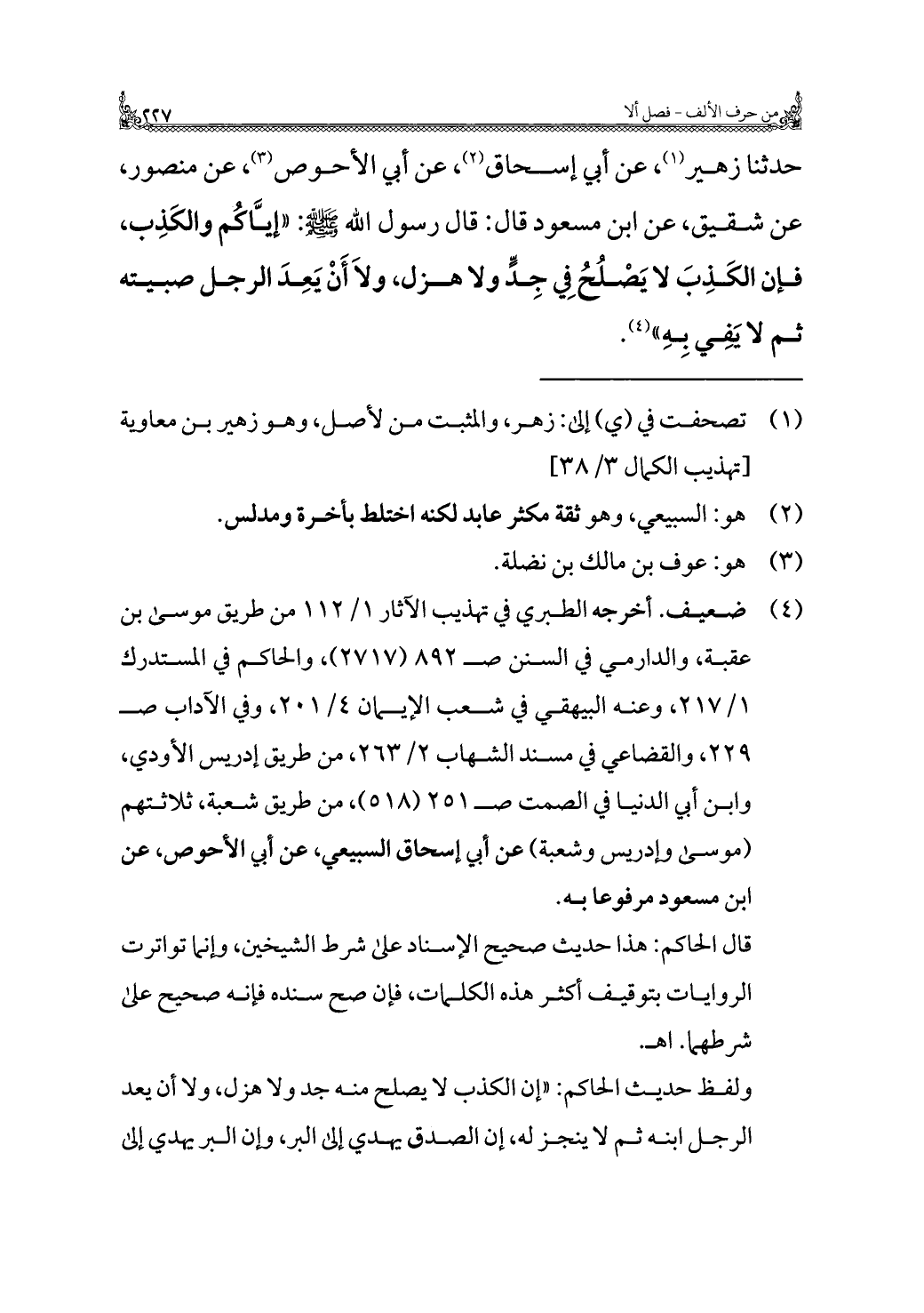 حدثنا زهير (¬١)، عن أبي إسحاق (¬٢)، عن أبي الأحوص (¬٣)، عن منصور، عن شقيق، عن ابن مسعود قال: قال رسول الله - صلى الله عليه وسلم -: "إيَّاكُم والكَذِب، فإن الكَذِبَ لا يَصْلُحُ فِي جِدٍّ ولا هزل، ولَا أَنْ يَعِدَ الرجل صبيته ثم لا يَفِي بِهِ" (¬٤).