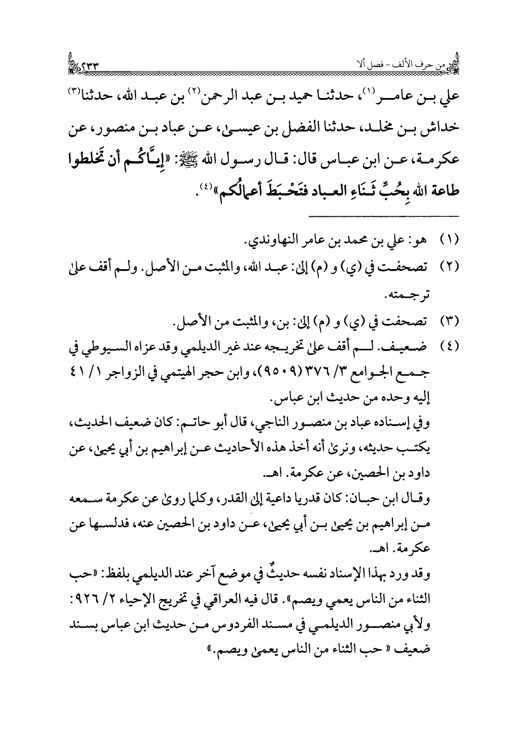 علي بن عامر (¬١)، حدثنا حميد بن عبد الرحمن (¬٢) بن عبد الله، حدثنا (¬٣) خداش بن مخلد، حدثنا الفضل بن عيسى، عن عباد بن منصور، عن عكرمة، عن ابن عباس قال: قال رسول الله - صلى الله عليه وسلم -: "إِيَّاكُم أن تَخلطوا طاعة الله بِحُبِّ ثَنَاءِ العباد فتَحْبَطَ أعماكم" (¬٤).