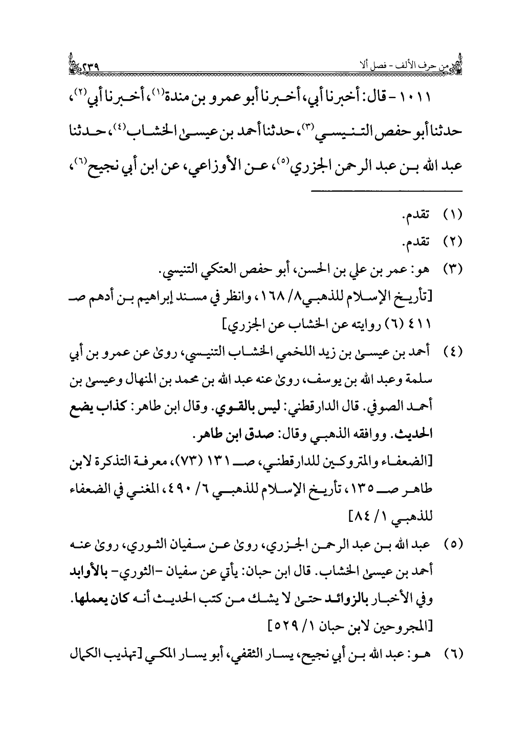 (¬٥) عبد الله بن عبد الرحمن الجزري، روى عن سفيان الثوري، روى عنه أحمد بن عيسى الخشاب. قال ابن حبان: يأتي عن سفيان - الثوري - بالأوابد وفي الأخبار بالزوائد حتى لا يشك من كتب الحديث أنه كان يعملها. [المجروحين لابن حبان ١/ ٥٢٩]