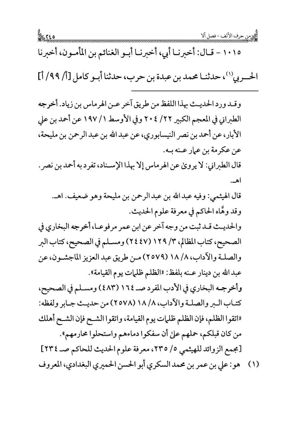 [مجمع الزوائد للهيثمي ٥/ ٢٣٥، معرفة علوم الحديث للحاكم صـ ٢٣٤]