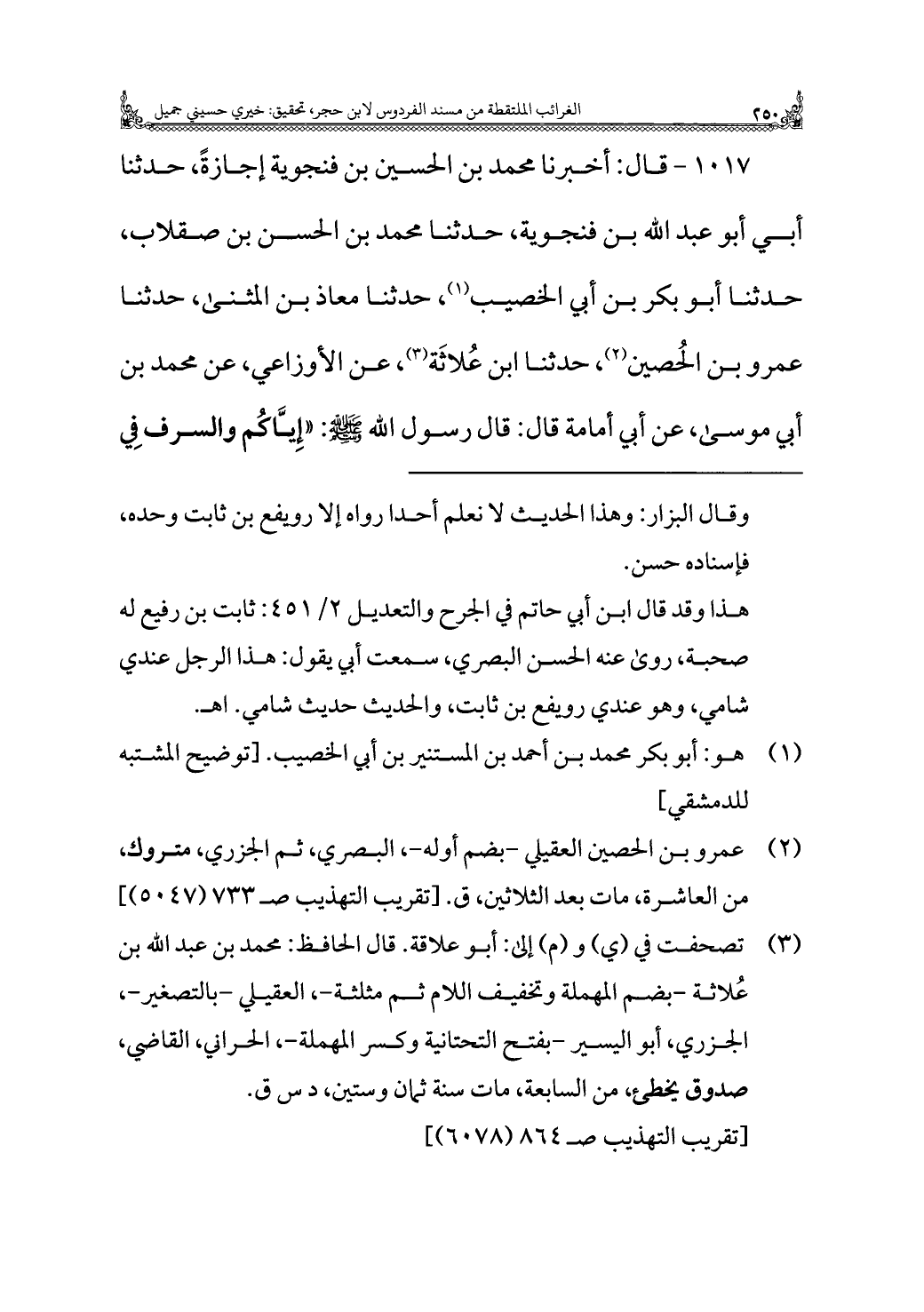 ١٠١٧ - قال: أخبرنا محمد بن الحسين بن فنجوية إجازةً، حدثنا أبي أبو عبد الله بن فنجوية، حدثنا محمد بن الحسن بن صقلاب، حدثنا أبو بكر بن أبي الخصيب (¬١)، حدثنا معاذ بن المثنى، حدثنا عمرو بن الحُصين (¬٢)، حدثنا ابن عُلاثَة (¬٣)، عن الأوزاعي، عن محمد بن أبي موسى، عن أبي أمامة قال: قال رسول الله - صلى الله عليه وسلم -: "إِيَّاكُم والسرف فِي