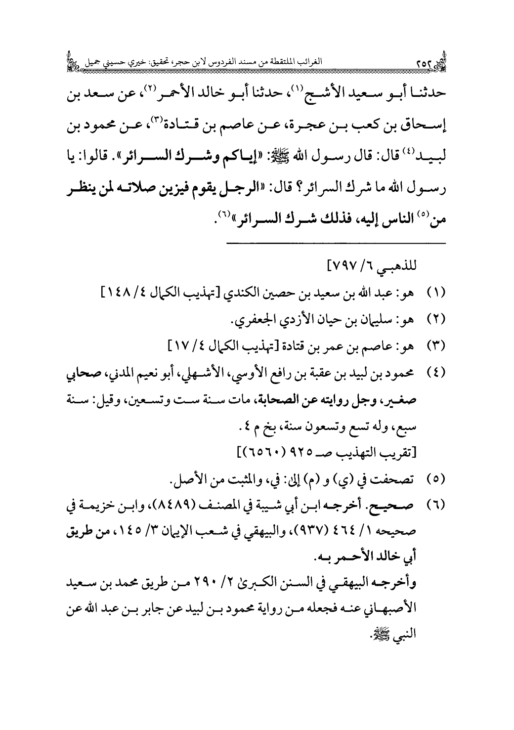 حدثنا أبو سعيد الأشج (¬١)، حدثنا أبو خالد الأحمر (¬٢)، عن سعد بن إسحاق بن كعب بن عجرة، عن عاصم بن قتادة (¬٣)، عن محمود بن لبيد (¬٤) قال: قال رسول الله - صلى الله عليه وسلم -: "إياكم وشرك السرائر". قالوا: يا رسول الله ما شرك السرائر؟ قال: "الرجل يقوم فيزين صلاته لمن ينظر من (¬٥) الناس إليه، فذلك شرك السرائر" (¬٦).