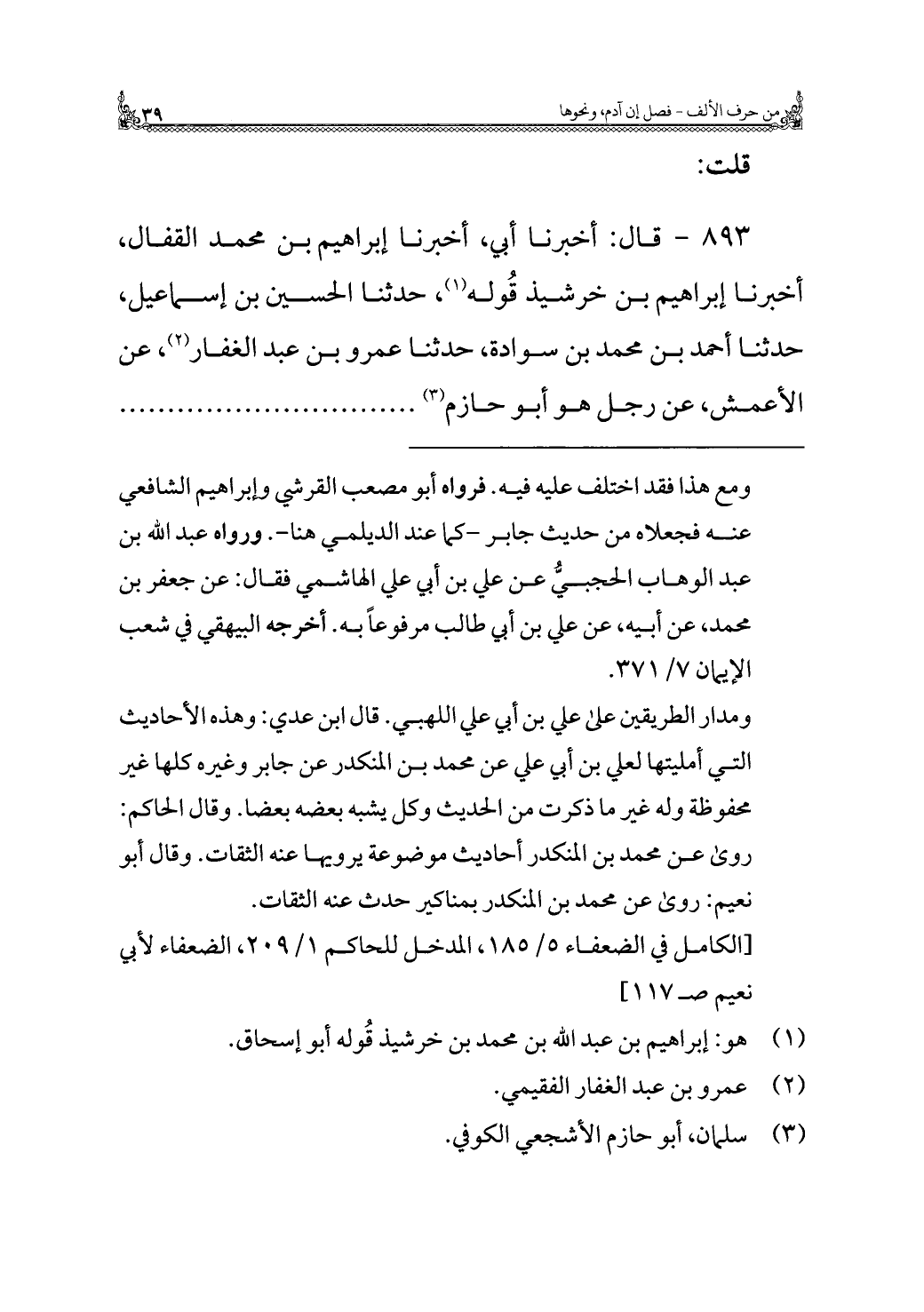 ٨٩٣ - قال: أخبرنا أبي، أخبرنا إبراهيم بن محمَّد القفال، أخبرنا إبراهيم بن خرشيذ قوله (¬١)، حدثنا الحسين بن إسماعيل، حدثنا أحمد بن محمَّد بن سوادة، حدثنا عمرو بن عبد الغفار (¬٢)، عن الأعمش، عن رجل هو أبو حازم (¬٣)