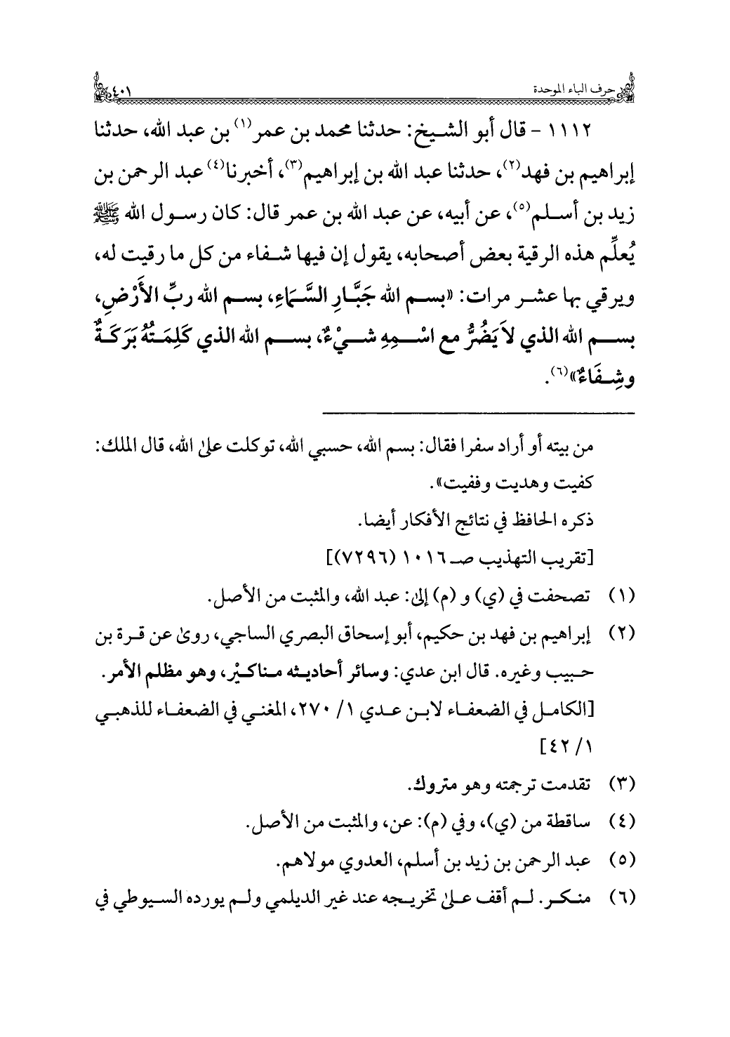 ١١١٢ - قال أبو الشيخ: حدثنا محمد بن عمر (¬١) بن عبد الله، حدثنا إبراهيم بن فهد (¬٢)، حدثنا عبد الله بن إبراهيم (¬٣)، أخبرنا (¬٤) عبد الرحمن بن زيد بن أسلم (¬٥)، عن أبيه، عن عبد الله بن عمر قال: كان رسول الله - صلى الله عليه وسلم - يُعلِّم هذه الرقية بعض أصحابه، يقول إن فيها شفاء من كل ما رقيت له، ويرقي بها عشر مرات: "بسم الله جَبَّارِ السَّمَاءِ، بسم الله ربِّ الأَرْضِ، بسم الله الذي لَا يَضُرُّ مع اسْمِهِ شيْءٌ، بسم الله الذي كلِمَتُهُ بَرَكَةٌ وشِفَاءٌ" (¬٦).