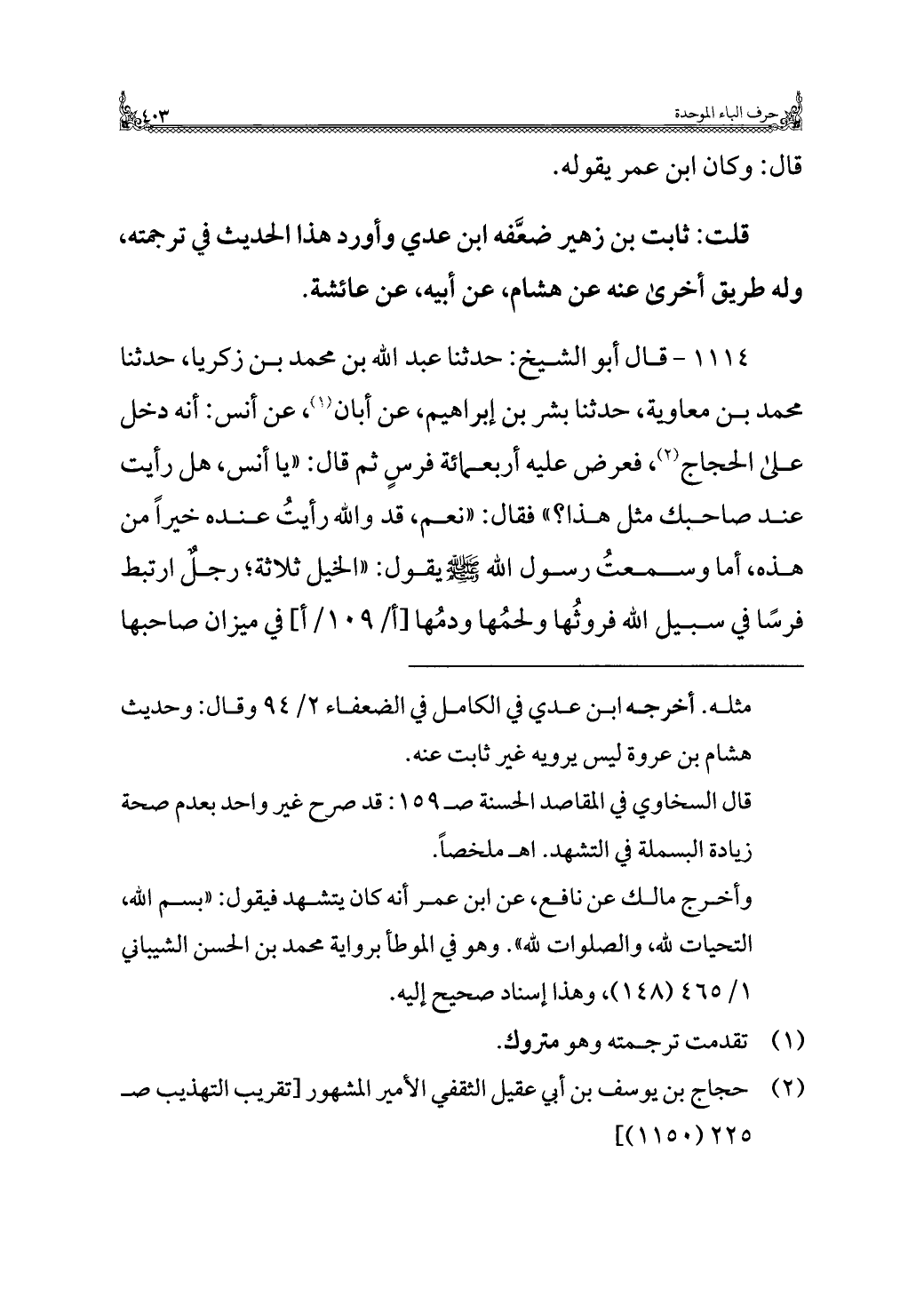١١١٤ - قال أبو الشيخ: حدثنا عبد الله بن محمد بن زكريا، حدثنا محمد بن معاوية، حدثنا بشر بن إبراهيم، عن أبان (¬١)، عن أنس: أنه دخل على الحجاج (¬٢)، فعرض عليه أربعمائة فرسٍ ثم قال: "يا أنس، هل رأيت عند صاحبك مثل هذا؟ " فقال: "نعم، قد والله رأيتُ عنده خيرًا من هذه، أما وسمعتُ رسول الله - صلى الله عليه وسلم - يقول: "الخيل ثلاثة؛ رجلٌ ارتبط فرسًا في سبيل الله فروثُها ولحمُها ودمُها في ميزان صاحبها