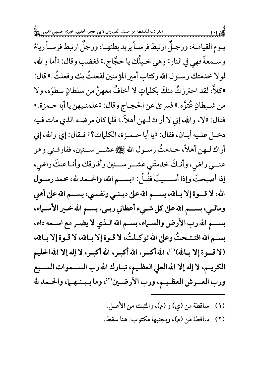 يوم القيامة، ورجلٌ ارتبط فرسًا يريد بطنها، ورجلٌ ارتبط فرسًا رياءً وسمعةً فهي في النار" وهي خيلُك يا حجَّاج". فغضب وقال: "أما والله، لولا خدمتك رسول الله وكتاب أمير المؤمنين لفعلتُ بك وفعلتُ". قال: "كلَّا، لقد احترزتُ منكَ بكلماتٍ لا أخافُ معهنَّ من سلطانٍ سطوَه، ولا من شيطانٍ عُتوَّه". فسرى عن الحجاج وقال: "علمنيهن يا أبا حمزة". فقال: "لا، والله، إني لا أراك لهن أهلًا". فلما كان مرضه الذي مات فيه دخل عليه أبان، فقال: "يا أبا حمزة، الكلمات؟ " فقال: إي والله، إني أراك لهن أهلًا، خدمتُ رسول الله - صلى الله عليه وسلم - عشر سنين، ففارقني وهو عني راضٍ، وأنكَ خدمتَني عشر سنين وأفارقك وأنا عنكَ راضٍ، إذا أصبحتَ وإذا أمسيتَ فقُلْ: "بسم الله، والحمد لله، محمد رسول الله، لا قوة إلا بالله، بسم الله على ديني ونفسي، بسم الله على أهلي ومالي، بسم الله على كل شيء أعطاني ربي، بسم الله خير الأسماء، بسم الله رب الأرض والسماء، بسم الله الذي لا يضر مع اسمه داء، بسم الله افتتحتُ وعلى الله توكلتُ، لا قوة إلا بالله، لا قوة إلا بالله، (لا قوة إلا بالله) (¬١)، الله أكبر، الله أكبر، الله أكبر، لا إله إلا الله الحليم الكريم، لا إله إلا الله العلي العظيم، تبارك الله رب السموات السبع ورب العرش العظيم، ورب الأرضين (¬٢)، وما بينهما، والحمد لله