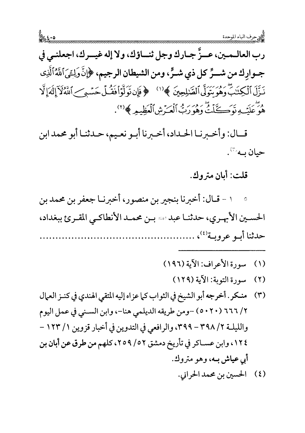 رب العالمين، عزَّ جارك وجل ثناؤك، ولا إله غيرك، اجعلني في جوارِك من شرِّ كل ذي شرٍّ، ومن الشيطان الرجيم، {إِنَّ وَلِيِّيَ اللَّهُ الَّذِي نَزَّلَ الْكِتَابَ وَهُوَ يَتَوَلَّى الصَّالِحِينَ} (¬١) {فَإِنْ تَوَلَّوْا فَقُلْ حَسْبِيَ اللَّهُ لَا إِلَهَ إِلَّا هُوَ عَلَيْهِ تَوَكَّلْتُ وَهُوَ رَبُّ الْعَرْشِ الْعَظِيمِ} (¬٢).