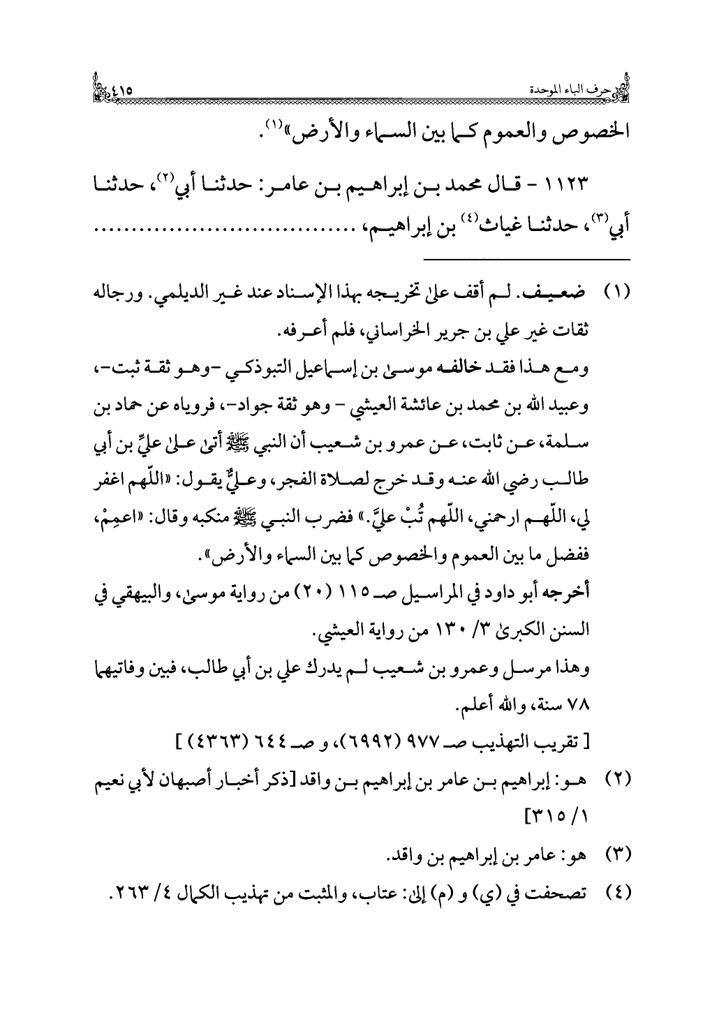١١٢٣ - قال محمد بن إبراهيم بن عامر: حدثنا أبي (¬٢)، حدثنا أبي (¬٣)، حدثنا غياث (¬٤) بن إبراهيم، . . . . . . . . . . . . .