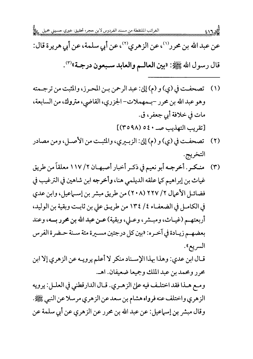 عن عبد الله بن محرر (¬١)، عن الزهري (¬٢)، عن أبي سلمة، عن أبي هريرة قال: قال رسول الله - صلى الله عليه وسلم -: "بين العالم والعابد سبعون درجة" (¬٣).
