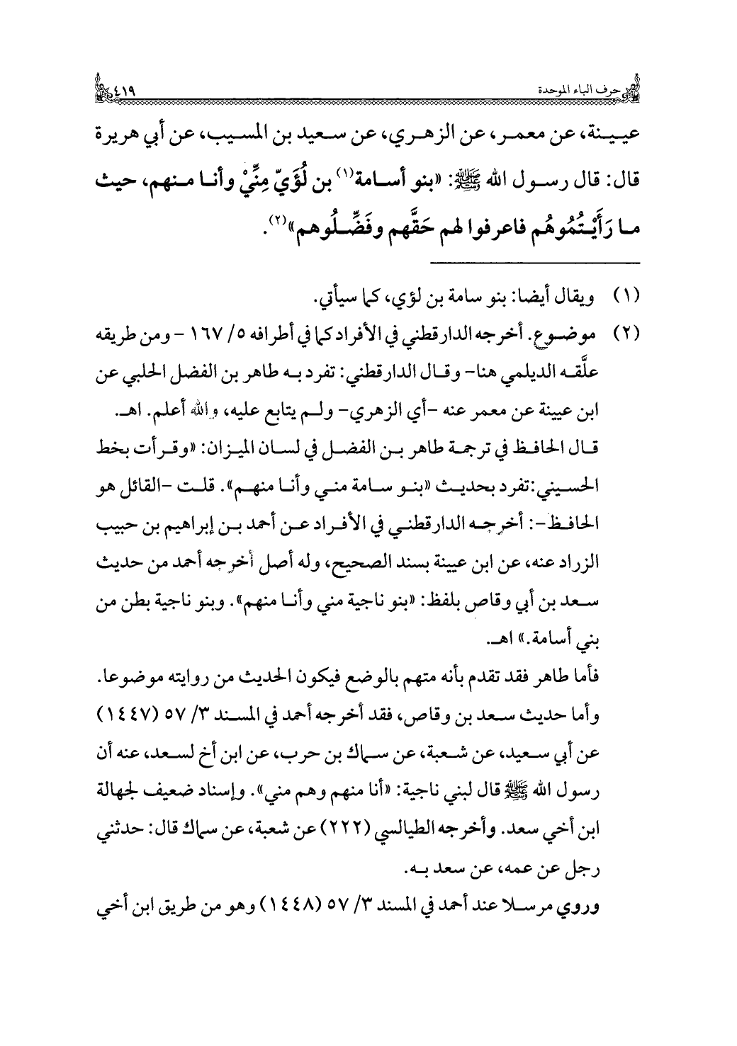 قال الحافظ في ترجمة طاهر بن الفضل في لسان الميزان: "وقرأت بخط الحسيني: تفرد بحديث "بنو سامة مني وأنا منهم". قلت - القائل هو الحافظ -: أخرجه الدارقطني في الأفراد عن أحمد بن إبراهيم بن حبيب الزراد عنه، عن ابن عيينة بسند الصحيح، وله أصل أخرجه أحمد من حديث سعد بن أبي وقاص بلفظ: "بنو ناجية مني وأنا منهم". وبنو ناجية بطن من بني أسامة". اهـ.