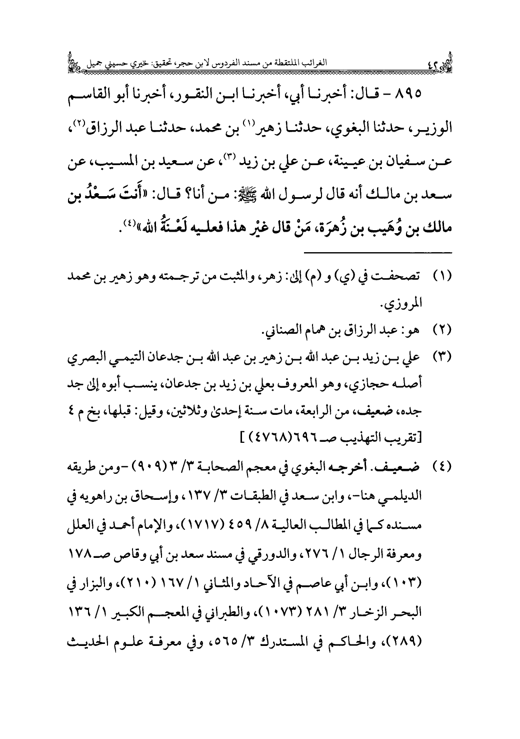 ٨٩٥ - قال: أخبرنا أبي، أخبرنا ابن النقور، أخبرنا أبو القاسم الوزير، حدثنا البغوي، حدثنا زهير (¬١) بن محمَّد، حدثنا عبد الرزاق (¬٢)، عن سفيان بن عيينة، عن علي بن زيد (¬٣)، عن سعيد بن المسيّب، عن سعد بن مالك أنَّه قال لرسول الله - صلى الله عليه وسلم -: من أنا؟ قال: "أَنتَ سَعْدُ بن مالك بن وُهَيب بن زُهرَة، مَنْ قال غير هذا فعليه لَعْنَةُ الله" (¬٤).