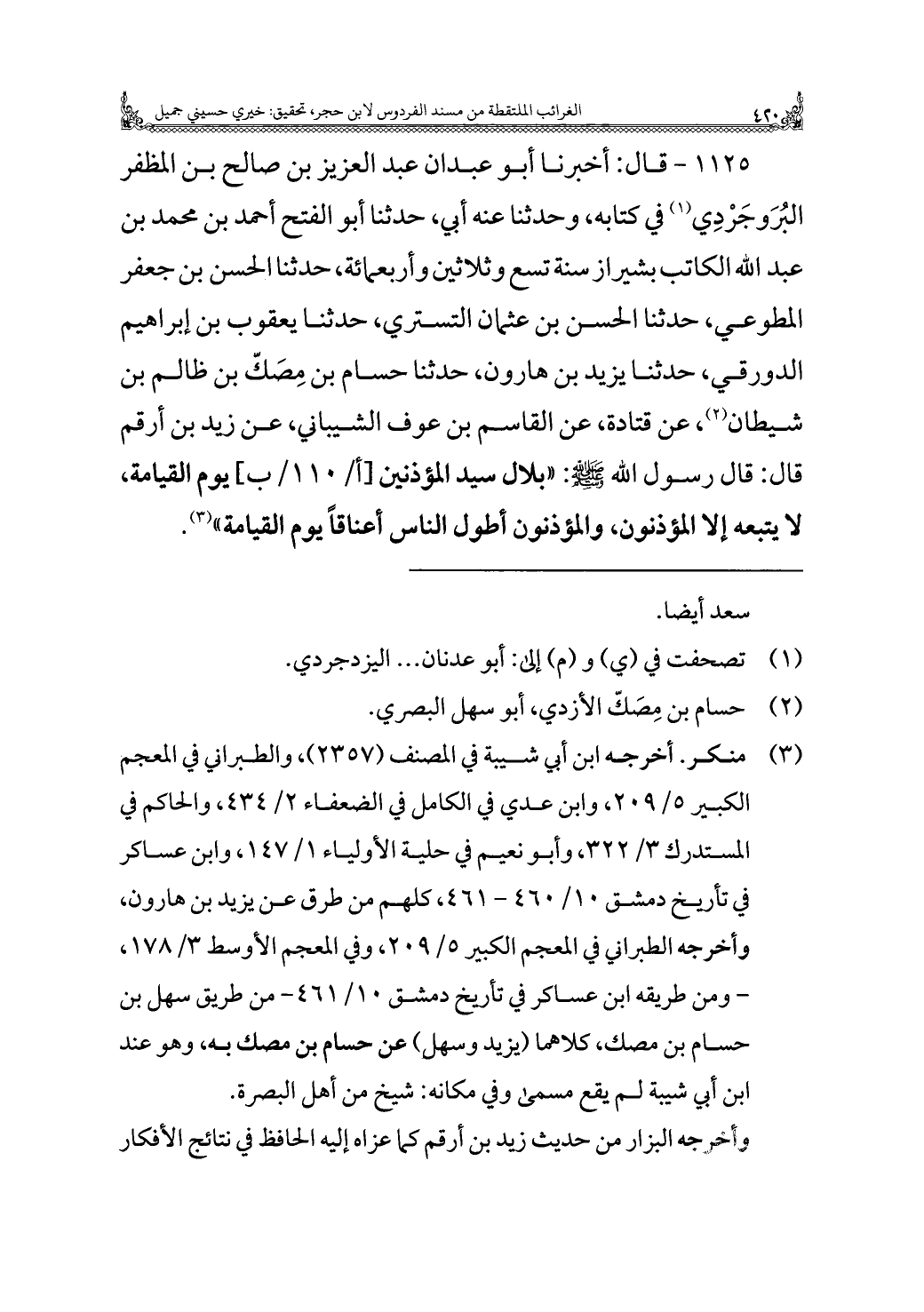 ١١٢٥ - قال: أخبرنا أبو عبدان عبد العزيز بن صالح بن المظفر البُرَوجَرْدِي (¬١) في كتابه، وحدثنا عنه أبي، حدثنا أبو الفتح أحمد بن محمد بن عبد الله الكاتب بشيراز سنة تسع وثلاثين وأربعمائة، حدثنا الحسن بن جعفر المطوعي، حدثنا الحسن بن عثمان التستري، حدثنا يعقوب بن إبراهيم الدورقي، حدثنا يزيد بن هارون، حدثنا حسام بن مِصَكّ بن ظالم بن شيطان (¬٢)، عن قتادة، عن القاسم بن عوف الشيباني، عن زيد بن أرقم قال: قال رسول الله - صلى الله عليه وسلم -: "بلال سيد المؤذنين يوم القيامة، لا يتبعه إلا المؤذنون، والمؤذنون أطول الناس أعناقًا يوم القيامة" (¬٣).