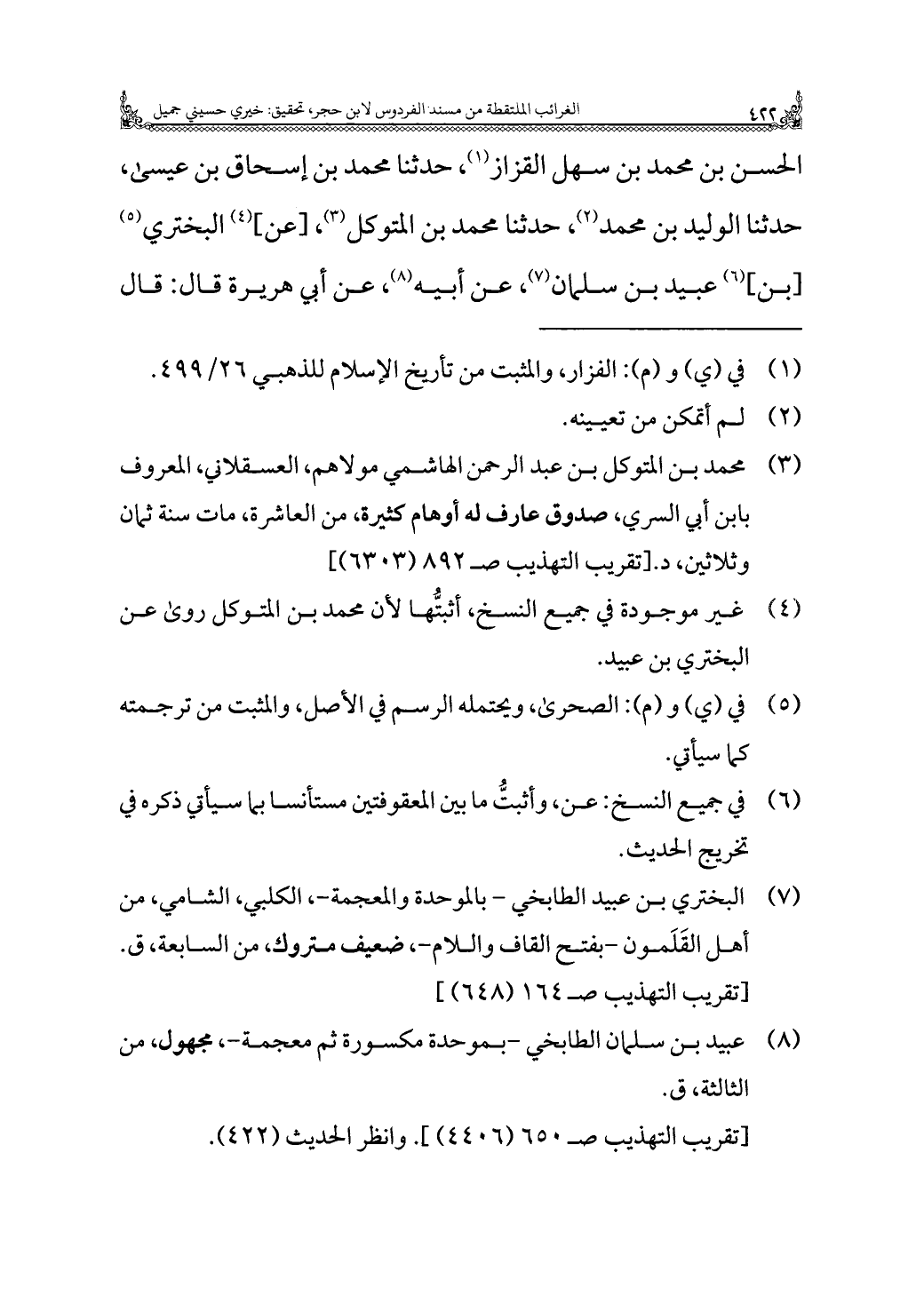 [تقريب التهذيب صـ ٦٥٠ (٤٤٠٦)]. وانظر الحديث (٤٢٢).