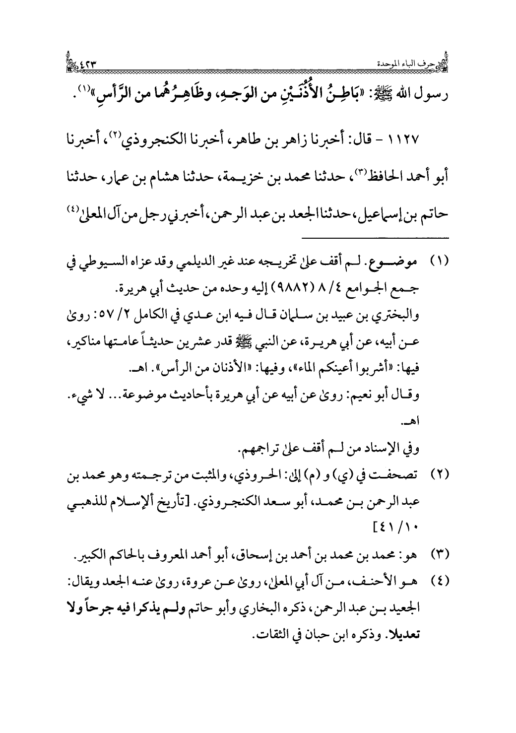 ١١٢٧ - قال: أخبرنا زاهر بن طاهر، أخبرنا الكنجروذي (¬٢)، أخبرنا أبو أحمد الحافظ (¬٣)، حدثنا محمد بن خزيمة، حدثنا هشام بن عمار، حدثنا حاتم بن إسماعيل، حدثنا الجعد بن عبد الرحمن، أخبرني رجل من آل المعلى (¬٤)