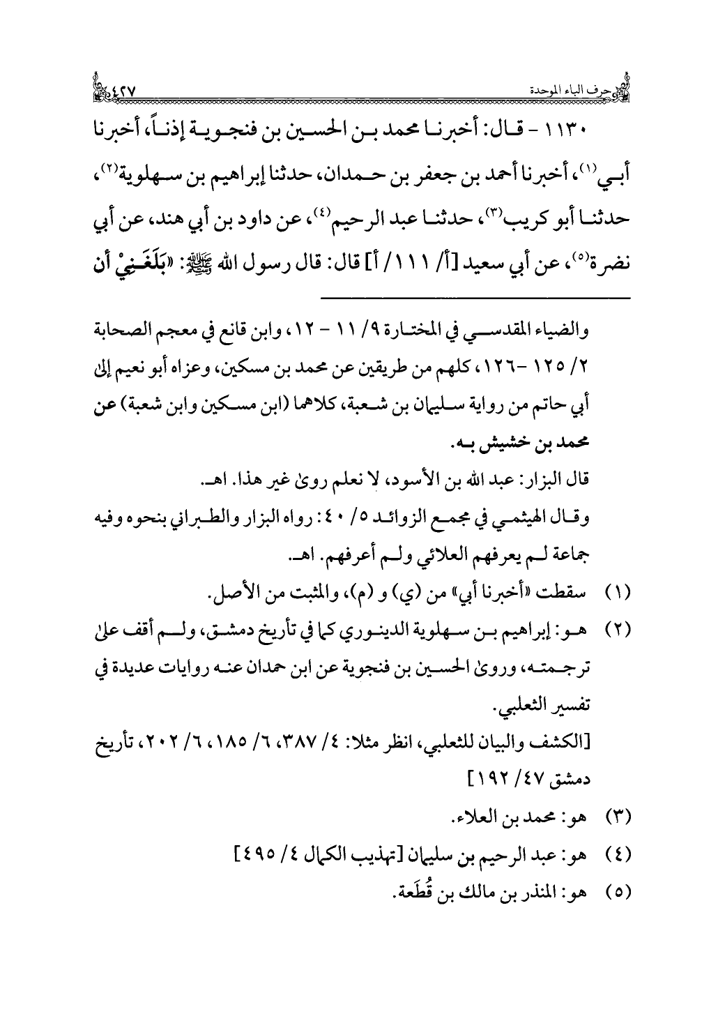 ١١٣٠ - قال: أخبرنا محمد بن الحسين بن فنجوية إذنًا، أخبرنا أبي (¬١)، أخبرنا أحمد بن جعفر بن حمدان، حدثنا إبراهيم بن سهلوية (¬٢)، حدثنا أبو كريب (¬٣)، حدثنا عبد الرحيم (¬٤)، عن داود بن أبي هند، عن أبي نضرة (¬٥)، عن أبي سعيد قال: قال رسول الله - صلى الله عليه وسلم -: "بَلَغَنِيْ أن