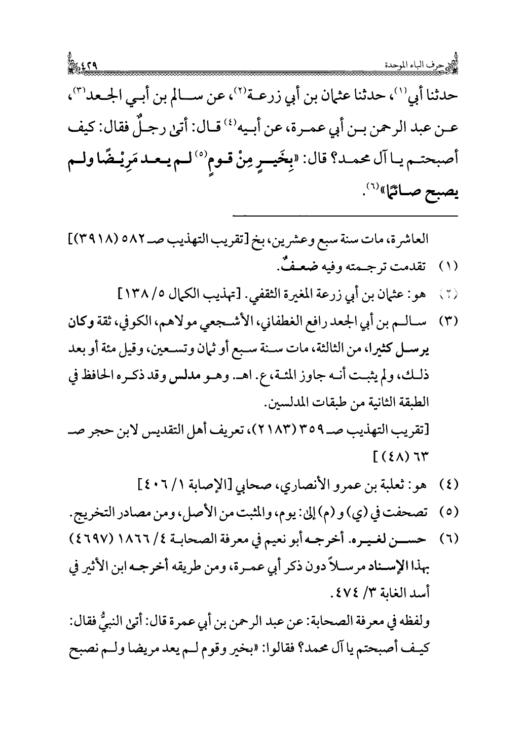 حدثنا أبي (¬١)، حدثنا عثمان بن أبي زرعة (¬٢)، عن سالم بن أبي الجعد (¬٣)، عن عبد الرحمن بن أبي عمرة، عن أبيه (¬٤) قال: أتى رجلٌ فقال: كيف أصبحتم يا آل محمد؟ قال: "بِخَيرٍ مِنْ قومٍ (¬٥) لم يعد مَرِيْضًا ولم يصبح صائمًا" (¬٦).