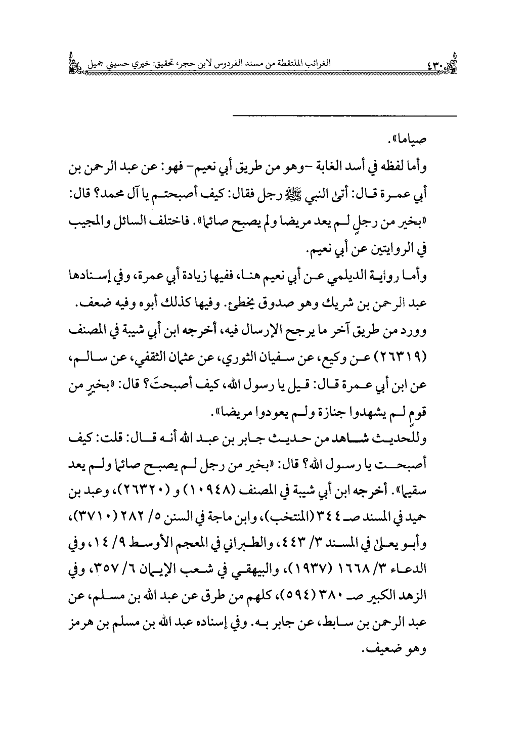 وأما لفظه في أسد الغابة - وهو من طريق أبي نعيم - فهو: عن عبد الرحمن بن أبي عمرة قال: أتى النبي - صلى الله عليه وسلم - رجل فقال: كيف أصبحتم يا آل محمد؟ قال: "بخير من رجلٍ لم يعد مريضًا ولم يصبح صائمًا". فاختلف السائل والمجيب في الروايتين عن أبي نعيم.