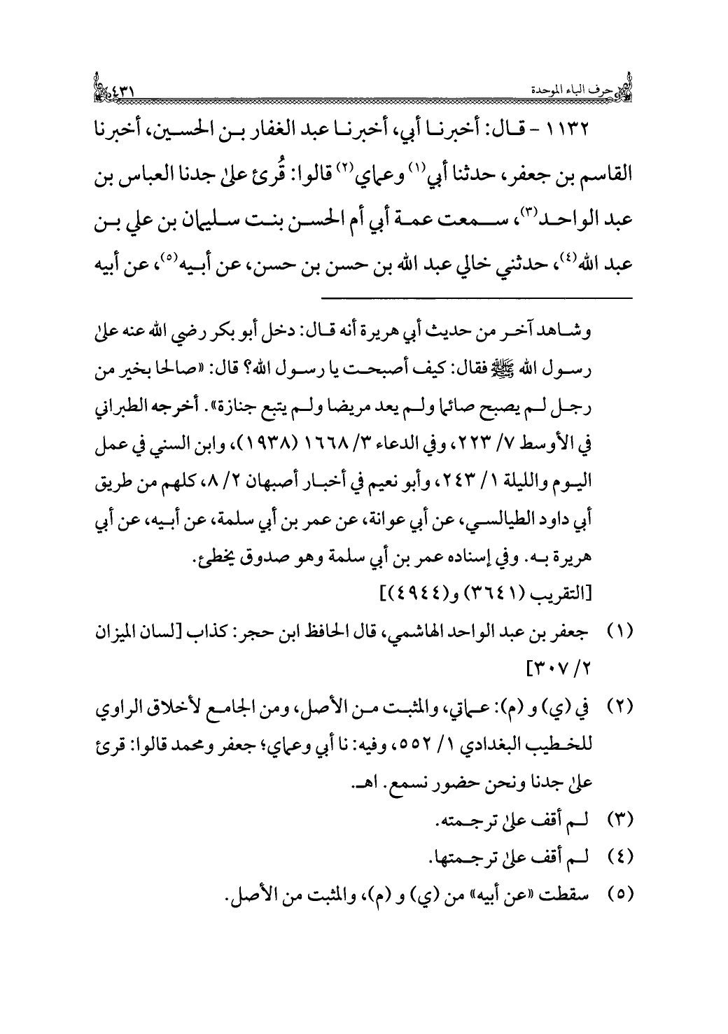 ١١٣٢ - قال: أخبرنا أبي، أخبرنا عبد الغفار بن الحسين، أخبرنا القاسم بن جعفر، حدثنا أبي (¬١) وعماي (¬٢) قالوا: قُرئ على جدنا العباس بن عبد الواحد (¬٣)، سمعت عمة أبي أم الحسن بنت سليمان بن علي بن عبد الله (¬٤)، حدثني خالي عبد الله بن حسن بن حسن، عن أبيه (¬٥)، عن أبيه