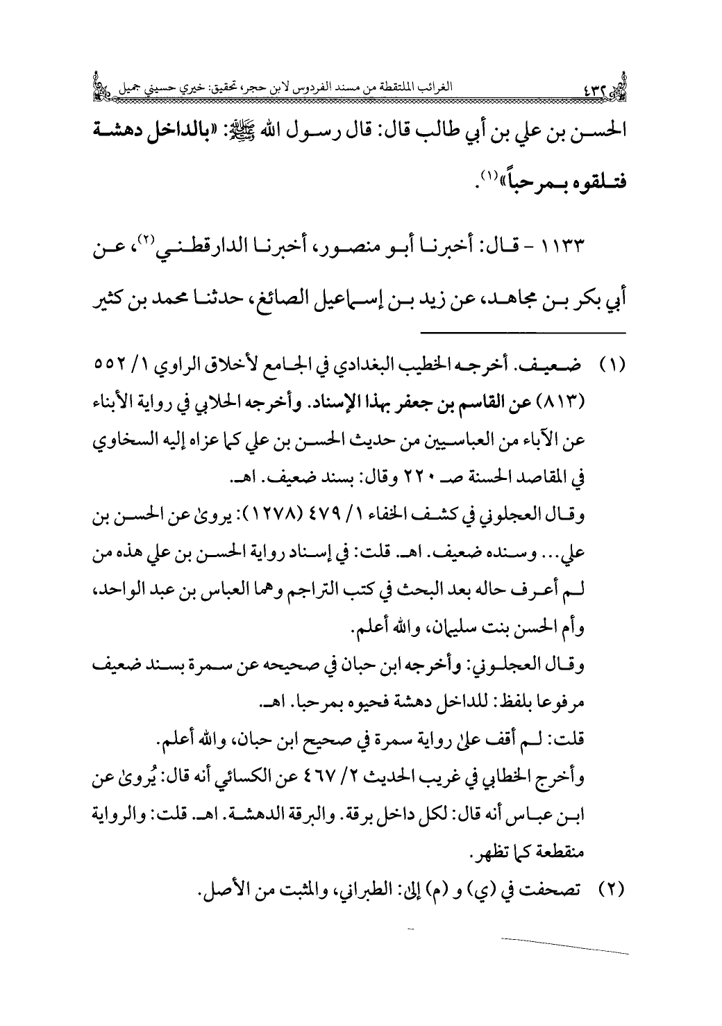 الحسن بن علي بن أبي طالب قال: قال رسول الله - صلى الله عليه وسلم -: "بالداخل دهشة فتلقوه بمرحبًا" (¬١).