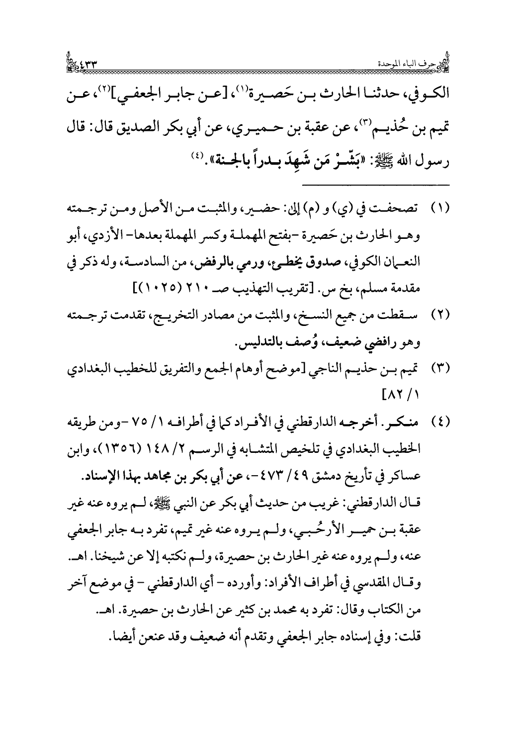 الكوفي، حدثنا الحارث بن حَصيرة (¬١)، [عن جابر الجعفي] (¬٢)، عن تميم بن حُذيم (¬٣)، عن عُقبة بن حميري، عن أبي بكر الصديق قال: قال رسول الله - صلى الله عليه وسلم -: "بَشّرْ مَن شَهِدَ بدرًا بالجنة". (¬٤)