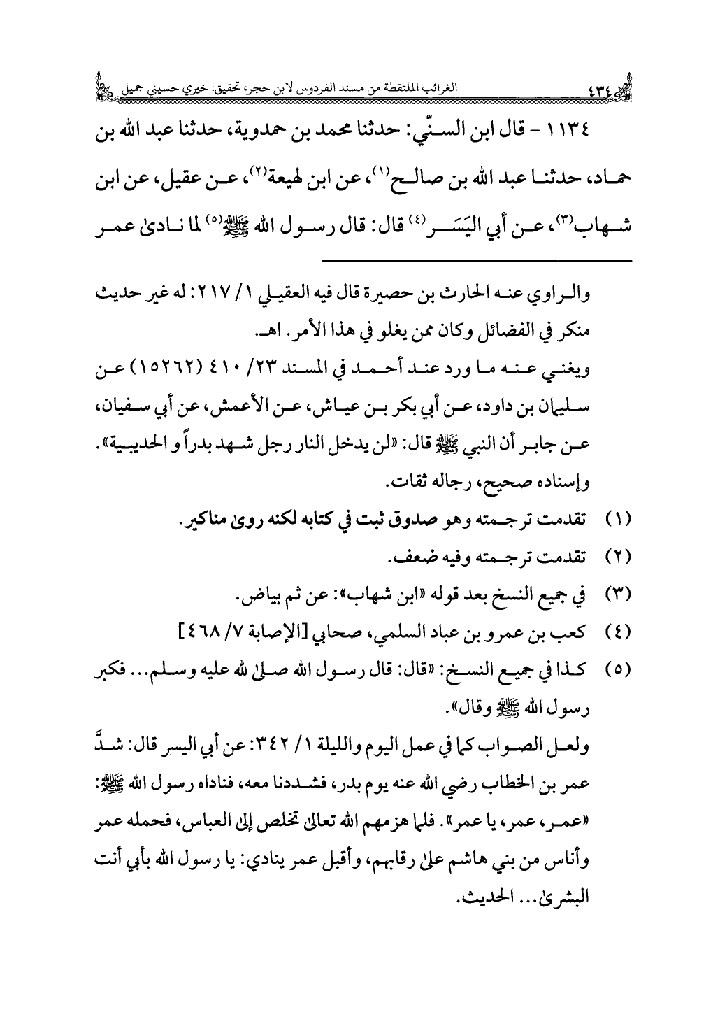 ١١٣٤ - قال ابن السنّي: حدثنا محمد بن حمدوية، حدثنا عبد الله بن حماد، حدثنا عبد الله بن صالح (¬١)، عن ابن لهيعة (¬٢)، عن عقيل، عن ابن شهاب (¬٣)، عن أبي اليَسَر (¬٤) قال: قال رسول الله - صلى الله عليه وسلم - (¬٥) لما نادى عمر