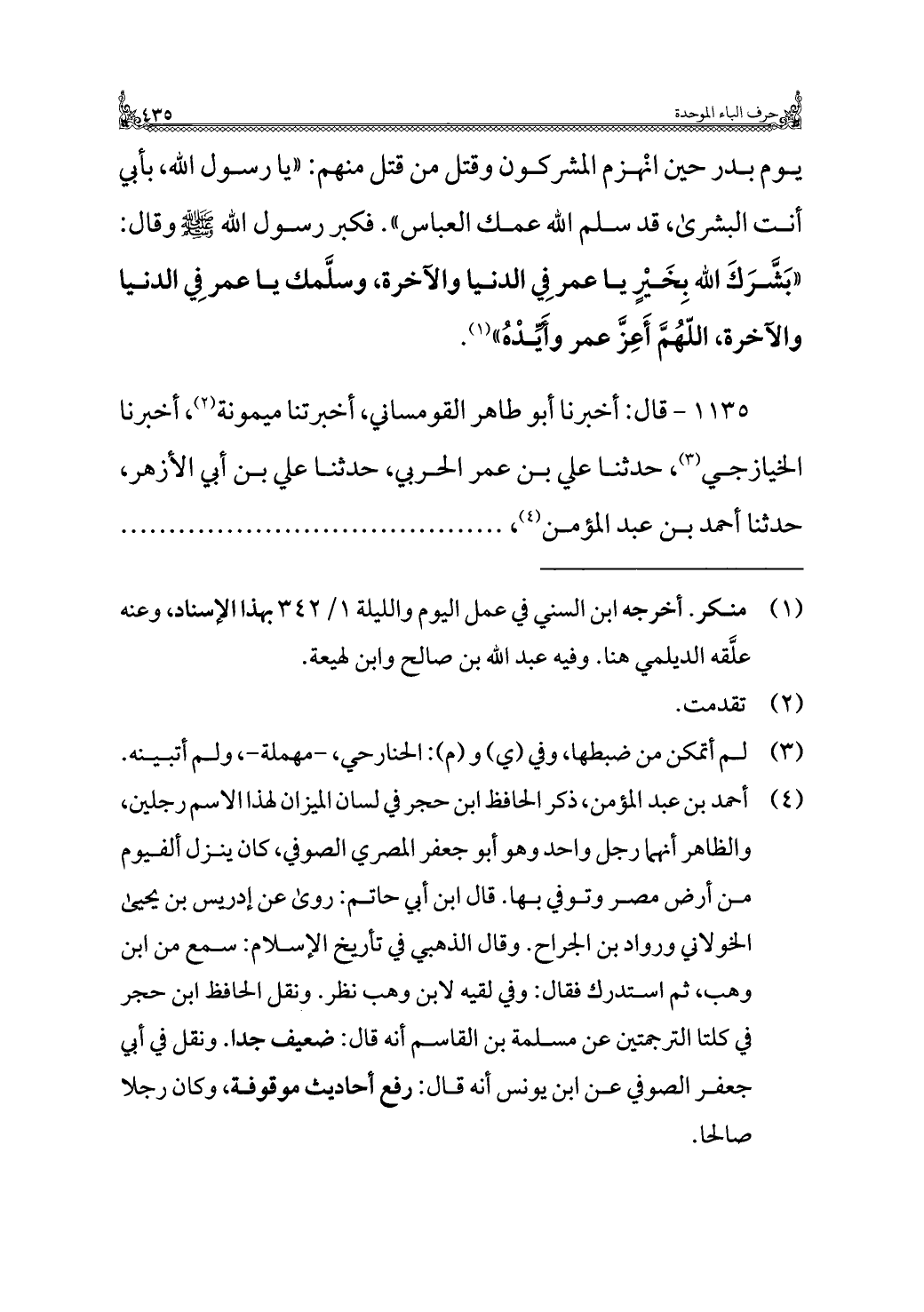 (¬٤) أحمد بن عبد المؤمن، ذكر الحافظ ابن حجر في لسان الميزان لهذا الاسم رجلين، والظاهر أنهما رجل واحد وهو أبو جعفر المصري الصوفي، كان ينزل الفيوم من أرض مصر وتوفي بها. قال ابن أبي حاتم: روى عن إدريس بن يحيى الخولاني ورواد بن الجراح. وقال الذهبي في تاريخ الإسلام: سمع من ابن وهب، ثم استدرك فقال: وفي لقيه لابن وهب نظر. ونقل الحافظ ابن حجر في كلتا الترجمتين عن مسلمة بن القاسم أنه قال: ضعيف جدًا. ونقل في أبي جعفر الصوفي عن ابن يونس أنه قال: رفع أحاديث موقوفة، وكان رجلًا صالحًا.