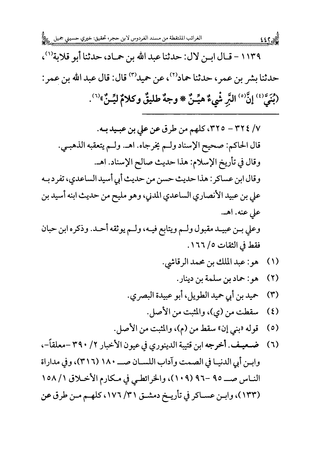 ١١٣٩ - قال ابن لال: حدثنا عبد الله بن حماد، حدثنا أبو قلابة (¬١)، حدثنا بشر بن عمر، حدثنا حماد (¬٢)، عن حميد (¬٣) قال: قال عبد الله بن عمر: (بُنَيَّ (¬٤) إنَّ (¬٥) البَّرِ شيْءٌ هيِّنٌ ... وجهٌ طليقٌ وكلامٌ ليِّنٌ" (¬٦).