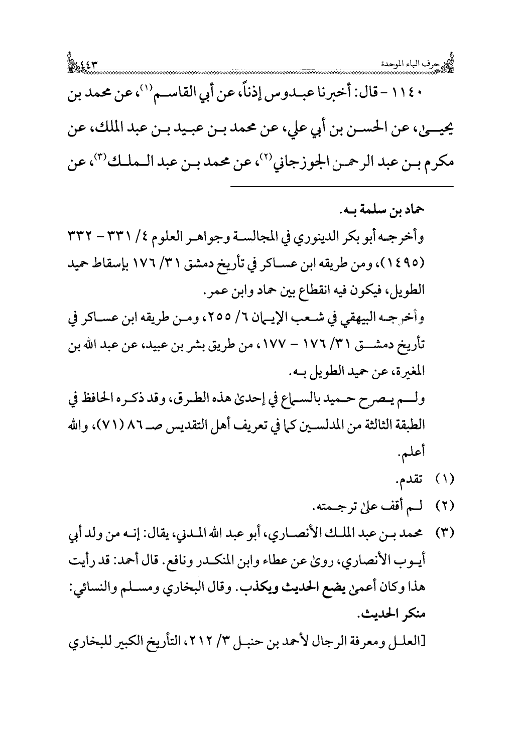 ١١٤٠ - قال: أخبرنا عبدوس إذنًا، عن أبي القاسم (¬١)، عن محمد بن يحيى، عن الحسن بن أبي علي، عن محمدبن عبيد بن عبد الملك، عن مكرم بن عبد الرحمن الجوزجاني (¬٢)، عن محمد بن عبد الملك (¬٣)، عن