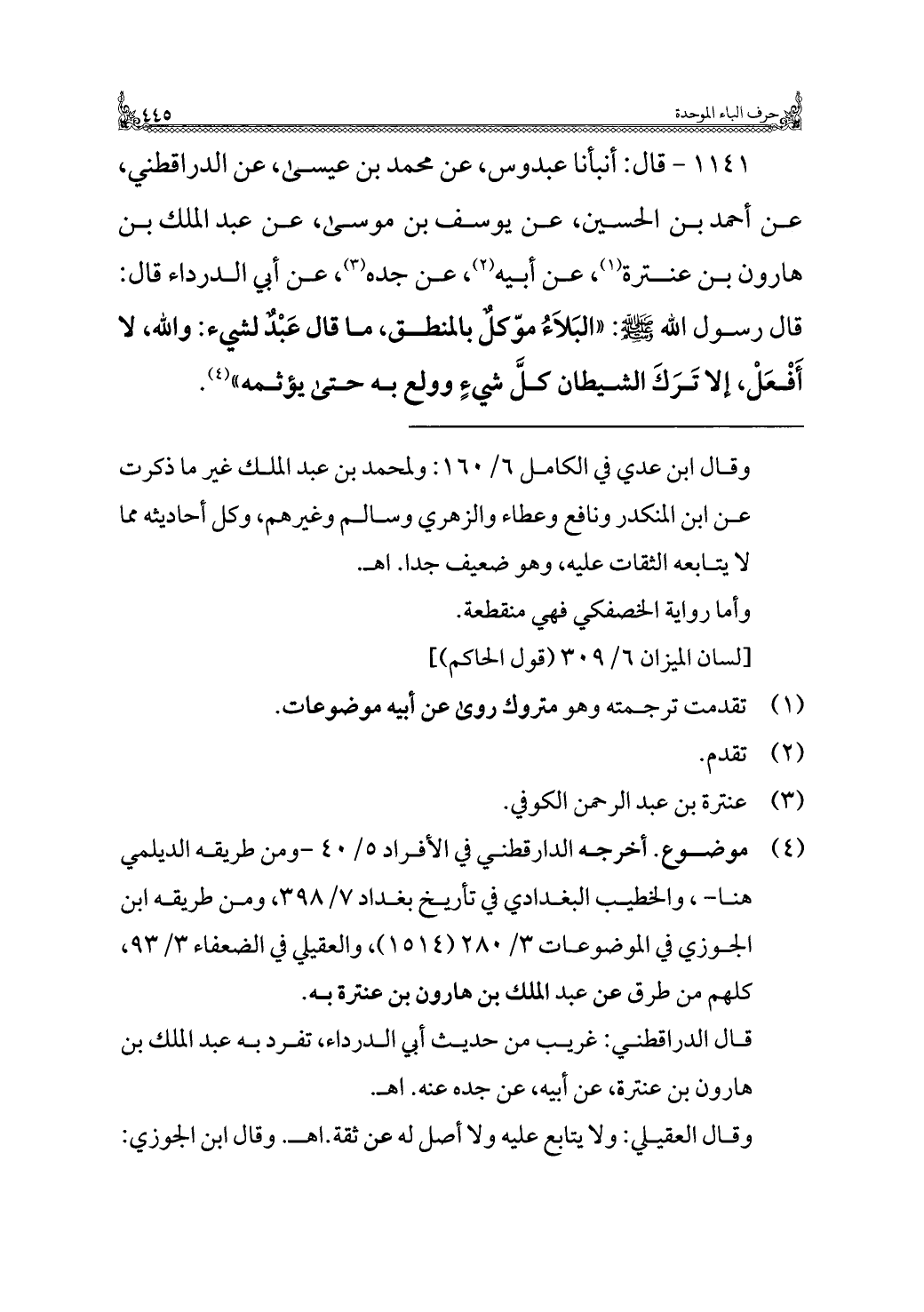 ١١٤١ - قال: أنبأنا عبدوس، عن محمد بن عيسي، عن الدارقطني، عن أحمد بن الحسين، عن يوسف بن موسى، عن عبد الملك بن هارون بن عنترة (¬١)، عن أبيه (¬٢)، عن جده (¬٣)، عن أبي الدرداء قال: قال رسول الله - صلى الله عليه وسلم -: "البَلَاءُ موّكلٌ بالمنطق، ما قال عَبْدٌ لشيء: والله، لا أَفْعَلْ، إلا تَرَكَ الشيطان كلَّ شيءٍ وولع به حتى يؤثمه" (¬٤).