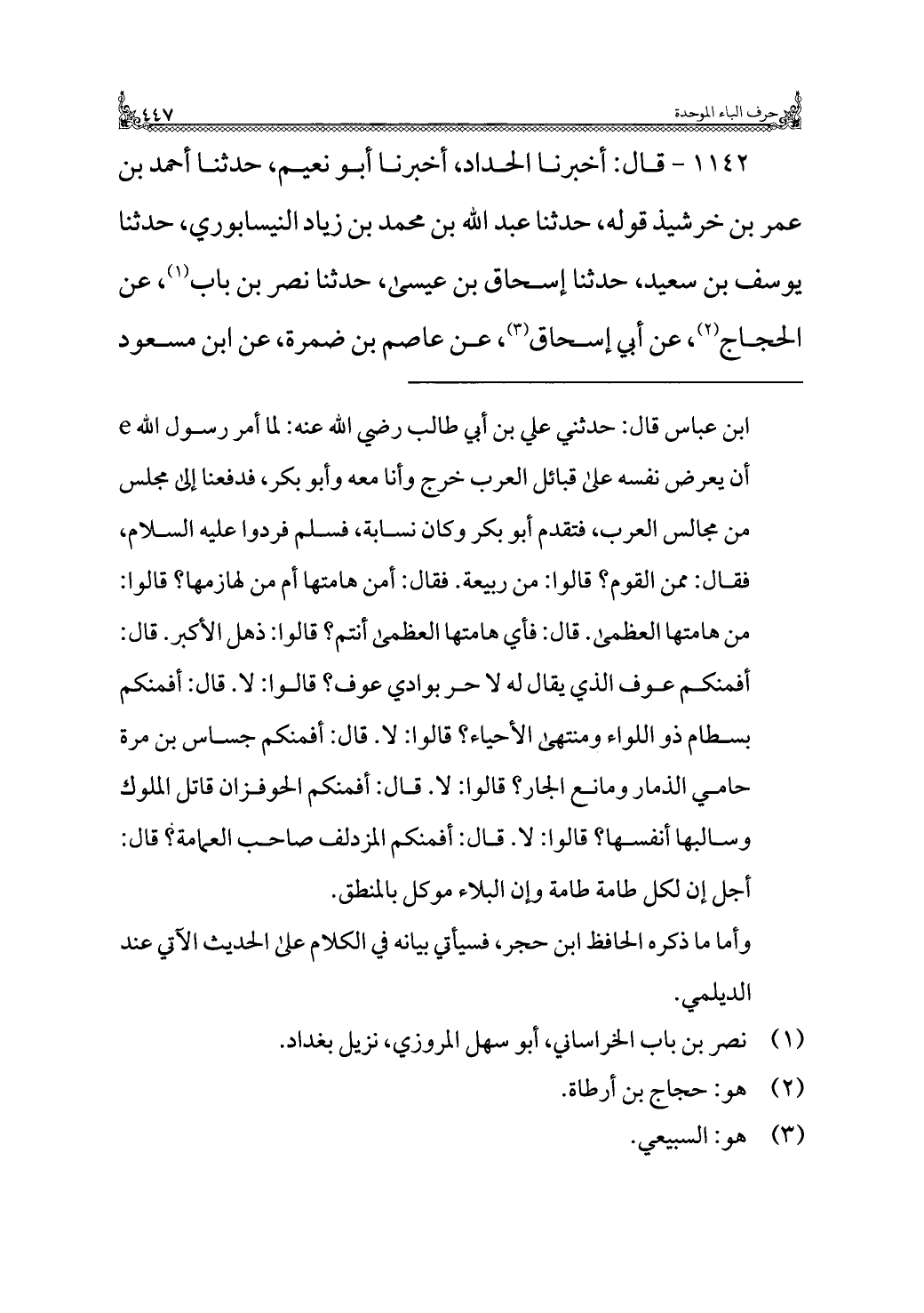 ١١٤٢ - قال: أخبرنا الحداد، أخبرنا أبو نعيم، حدثنا أحمد بن عمر بن خرشيذ قوله، حدثنا عبد الله بن محمد بن زياد النيسابوري، حدثنا يوسف بن سعيد، حدثنا إسحاق بن عيسي، حدثنا نصر بن باب (¬١)، عن الحجاج (¬٢)، عن أبي إسحاق (¬٣)، عن عاصم بن ضمرة، عن ابن مسعود
