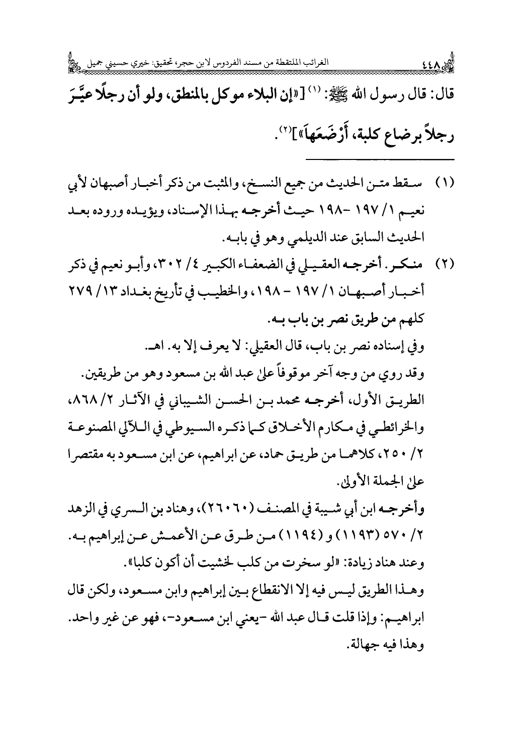 (¬٢) منكر. أخرجه العقيلي في الضعفاء الكبير ٤/ ٣٠٢، وأبو نعيم في ذكر أخبار أصبهان ١/ ١٩٧ - ١٩٨، والخطيب في تاريخ بغداد ١٣/ ٢٧٩ كلهم من طريق نصر بن باب به.