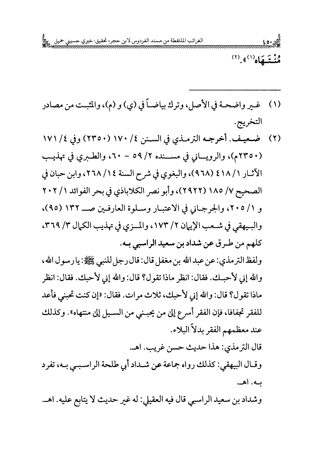 (¬٢) ضعيف. أخرجه الترمذي في السنن ٤/ ١٧٠ (٢٣٥٠) وفي ٤/ ١٧١ (٢٣٥٠ م)، والروياني في مسنده ٢/ ٥٩ - ٦٠، والطبري في تهذيب الآثار ١/ ٤١٨ (٩٦٨)، والبغوي في شرح السنة ١٤/ ٢٦٨، وابن حبان في الصحيح ٧/ ١٨٥ (٢٩٢٢)، وأبو نصر الكلاباذي في بحر الفوائد ١/ ٢٠٢ و ١/ ٢٠٥، والجرجاني في الاعتبار وسلوة العارفين صـ ١٣٢ (٩٥)، والبيهقي في شعب الإيمان ٢/ ١٧٣، والمزي في تهذيب الكمال ٣/ ٣٦٩، كلهم من طرق عن شداد بن سعيد الراسبي به.