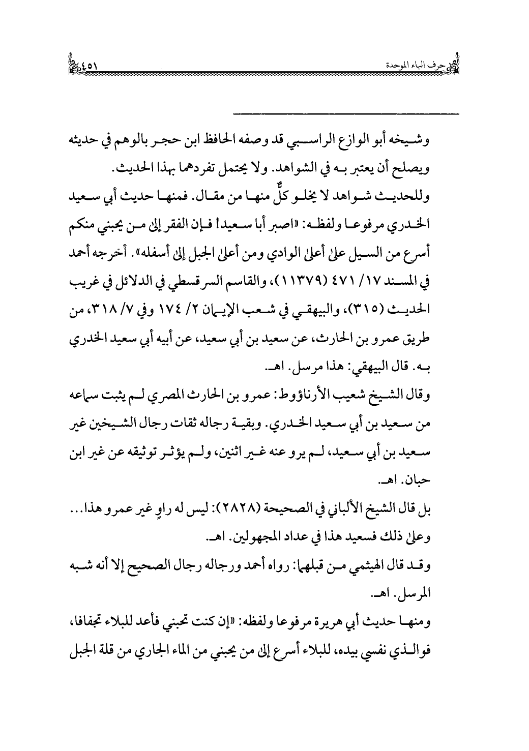 وقال الشيخ شعيب الأرناؤوط: عمرو بن الحارث المصري لم يثبت سماعه من سعيد بن أبي سعيد الخدري. وبقية رجاله ثقات رجال الشيخين غير سعيد بن أبي سعيد، لم يرو عنه غير اثنين، ولم يؤثر توثيقه عن غير ابن حبان. اهـ.