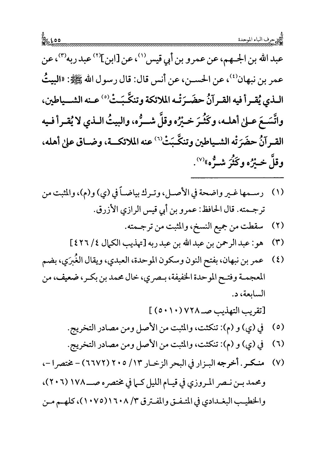 عبد الله بن الجهم، عن عمرو بن أبي قيس (¬١)، عن [ابن] (¬٢) عبد ربه (¬٣)، عن عمر بن نبهان (¬٤)، عن الحسن، عن أنس قال: قال رسول الله - صلى الله عليه وسلم -: "البيتُ الذي يُقرأ فيه القرآنُ حضَرَتْه الملائكة وتنكَّبَتْ (¬٥) عنه الشياطين، واتَّسَعَ على أهله، وكَثُرَ خيْرُه وقلَّ شرُّه، والبيتُ الذي لا يُقرأ فيه القرآنُ حضَرَتْه الشياطين وتنكَّبَتْ (¬٦) عنه الملائكة، وضاق على أهله، وقلَّ خيْرُه وكَثُرَ شرُّه" (¬٧).