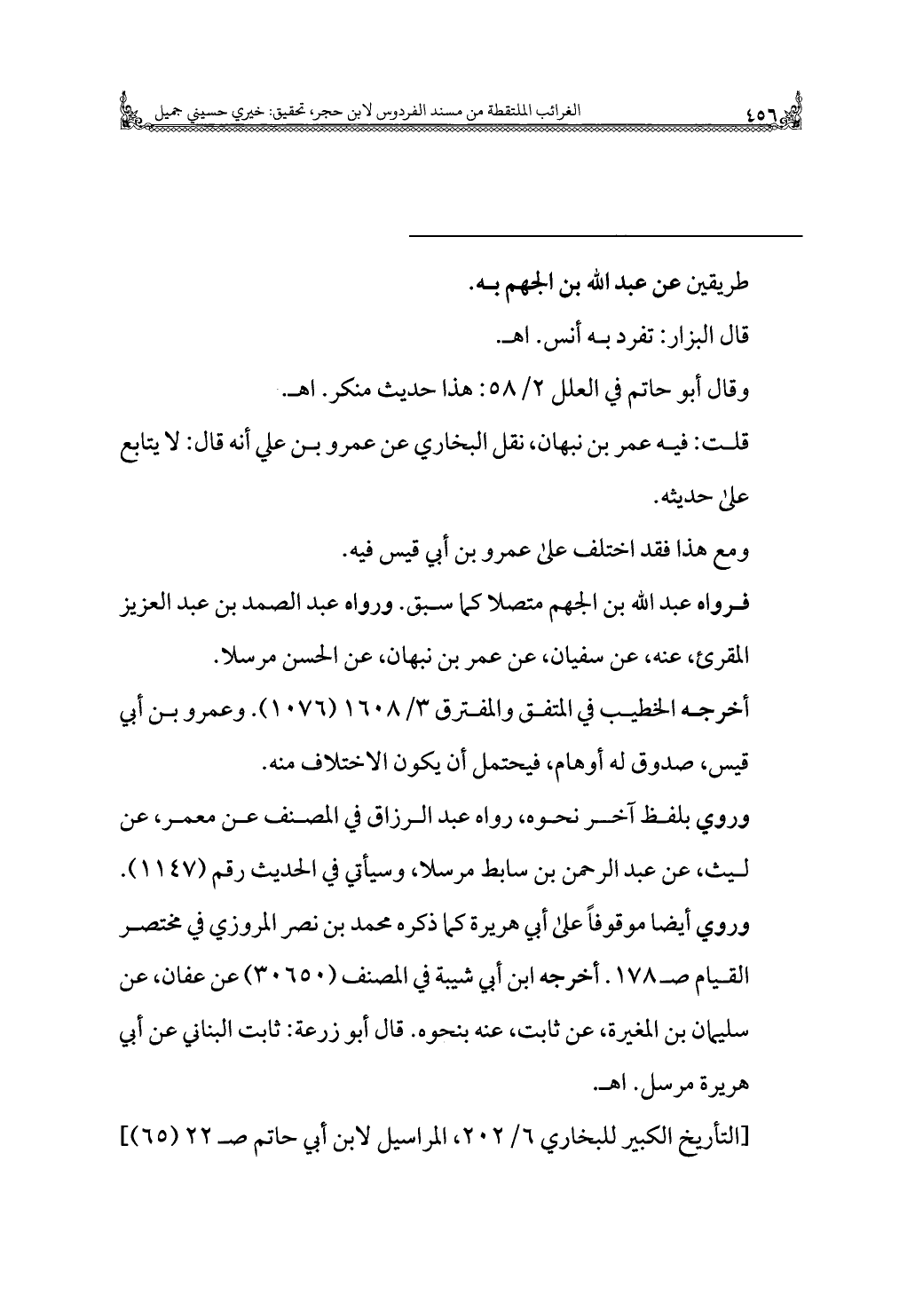 وروي بلفظ آخر نحوه، رواه عبد الرزاق في المصنف عن معمر، عن ليث، عن عبد الرحمن بن سابط مرسلًا، وسيأتي في الحديث رقم (١١٤٧). وروي أيضًا موقوفًا على أبي هريرة كما ذكره محمد بن نصر المروزي في مختصر القيام صـ ١٧٨. أخرجه ابن أبي شيبة في المصنف (٣٠٦٥٠) عن عفان، عن سليمان بن المغيرة، عن ثابت، عنه بنحوه. قال أبو زرعة: ثابت البناني عن أبي هريرة مرسل. اهـ.