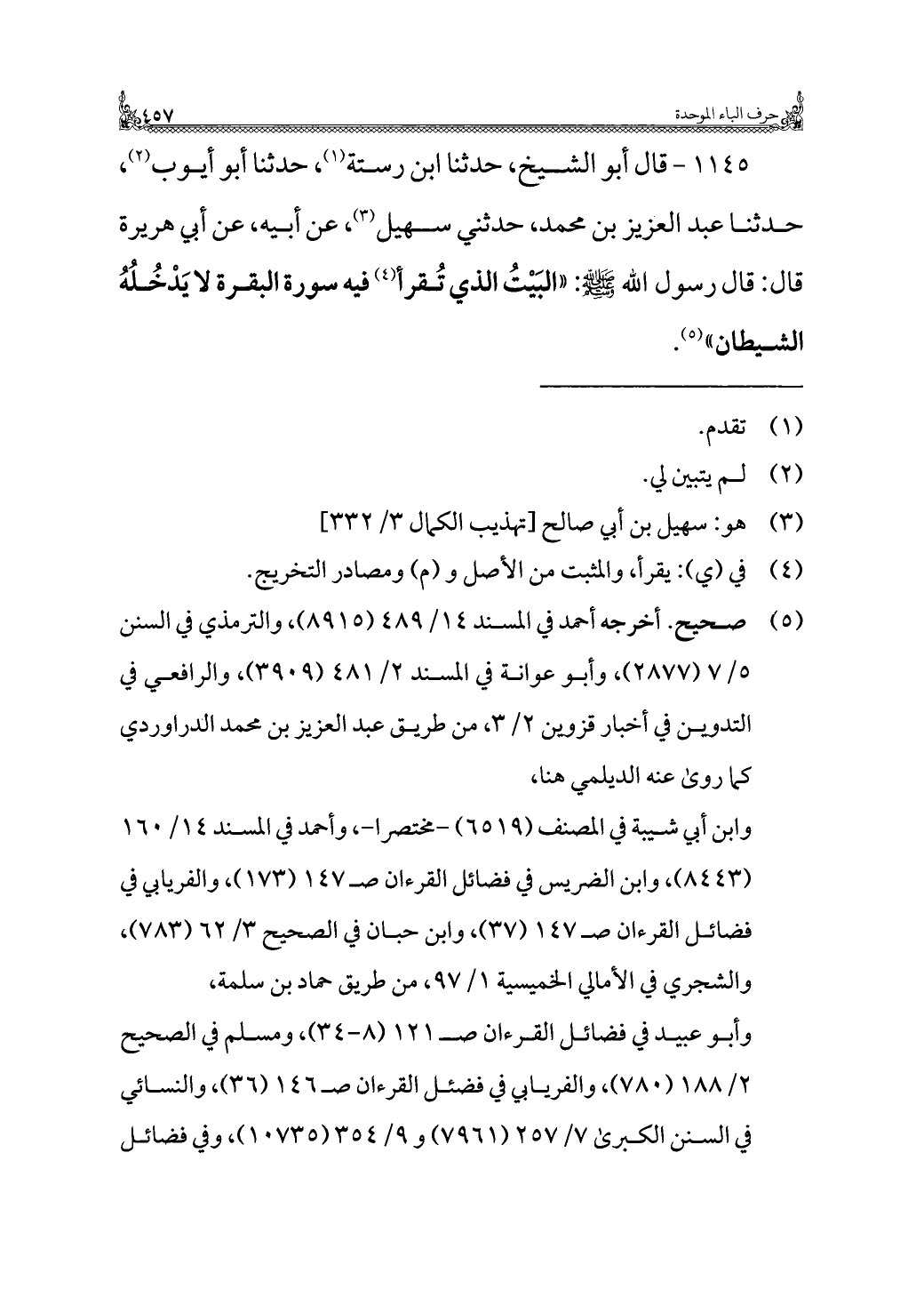 ١١٤٥ - قال أبو الشيخ، حدثنا ابن رستة (¬١)، حدثنا أبو أيوب (¬٢)، حدثنا عبد العزيز بن محمد، حدثني سهيل (¬٣)، عن أبيه، عن أبي هريرة قال: قال رسول الله - صلى الله عليه وسلم -: "البَيْتُ الذي تُقرأ (¬٤) فيه سورة البقرة لا يَدْخُلُهُ الشيطان" (¬٥).