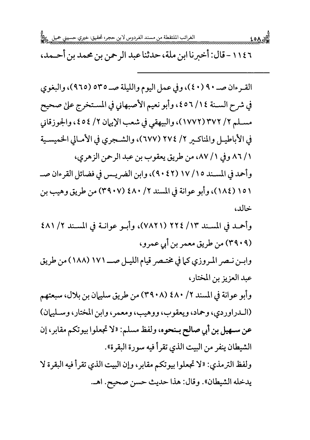 ولفظ الترمذي: "لا تجعلوا بيوتكم مقابر، وإن البيت الذي تقرأ فيه البقرة لا يدخله الشيطان". وقال: هذا حديث حسن صحيح. اهـ.