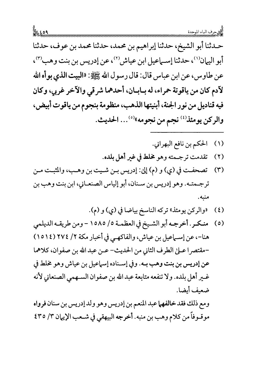 حدثنا أبو الشيخ، حدثنا إبراهيم بن محمد، حدثنا محمد بن عوف، حدثنا أبو اليمان (¬١)، حدثنا إسماعيل بن عياش (¬٢)، عن إدريس بن بنت وهب (¬٣)، عن طاوس، عن ابن عباس قال: قال رسول الله - صلى الله عليه وسلم -: "البيت الذي بوأه الله لآدم كان من ياقوتة حمراء، له بابان، أحدهما شرقي والآخر غربي، وكان فيه قناديل من نور الجنة، أبنيتها الذهب، منظومة بنجوم من ياقوت أبيض، والركن يومئذ (¬٤) نجم من نجومه" (¬٥). . . الحديث.