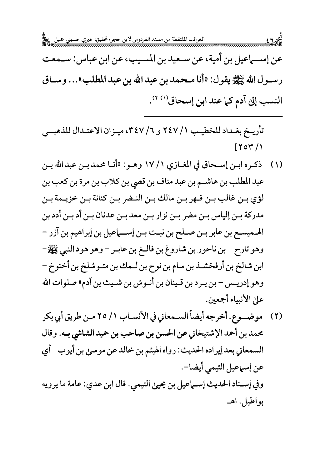 عن إسماعيل بن أمية، عن سعيد بن المسيّب، عن ابن عباس: سمعت رسول الله - صلى الله عليه وسلم - يقول: "أنا محمَّد بن عبد الله بن عبد المطلب" ... وساق النسب إلى آدم كما عند ابن إسحاق (¬١) (¬٢).