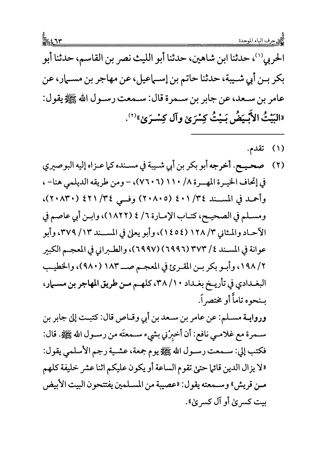 الحربي (¬١)، حدثنا ابن شاهين، حدثنا أبو الليث نصر بن القاسم، حدثنا أبو بكر بن أبي شيبة، حدثنا حاتم بن إسماعيل، عن مهاجر بن مسمار، عن عامر بن سعد، عن جابر بن سمرة قال: سمعت رسول الله - صلى الله عليه وسلم - يقول: "البَيْتُ الأَبْيَضُ بَيْتُ كِسْرَى وآل كِسْرَى" (¬٢).