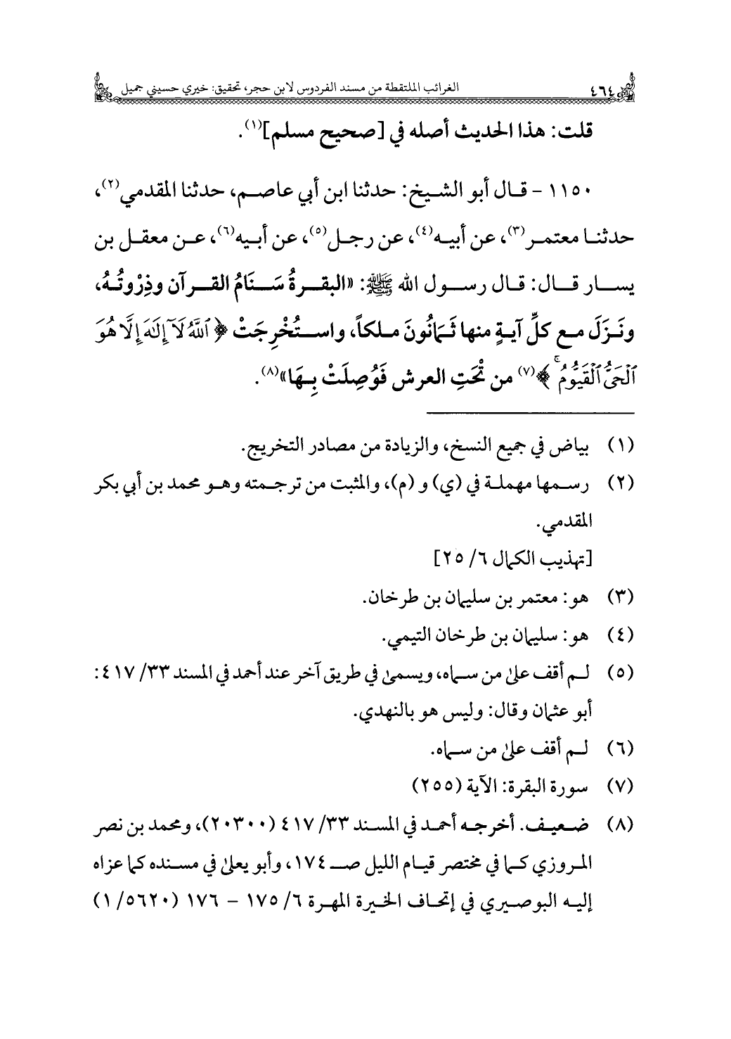 ١١٥٠ - قال أبو الشيخ: حدثنا ابن أبي عاصم، حدثنا المقدمي (¬٢)، حدثنا معتمر (¬٣)، عن أبيه (¬٤)، عن رجل (¬٥)، عن أبيه (¬٦)، عن معقل بن يسار قال: قال رسول الله - صلى الله عليه وسلم -: "البقرةُ سَنَامُ القرآن وذِرْوتُهُ، ونَزَلَ مع كلِّ آيةٍ منها ثَمَانُونَ ملكًا، واستُخْرِجَتْ {اللَّهُ لَا إِلَهَ إِلَّا هُوَ الْحَيُّ الْقَيُّومُ} (¬٧) من تْحَتِ العرش فَوُصِلَتْ بِهَا" (¬٨).