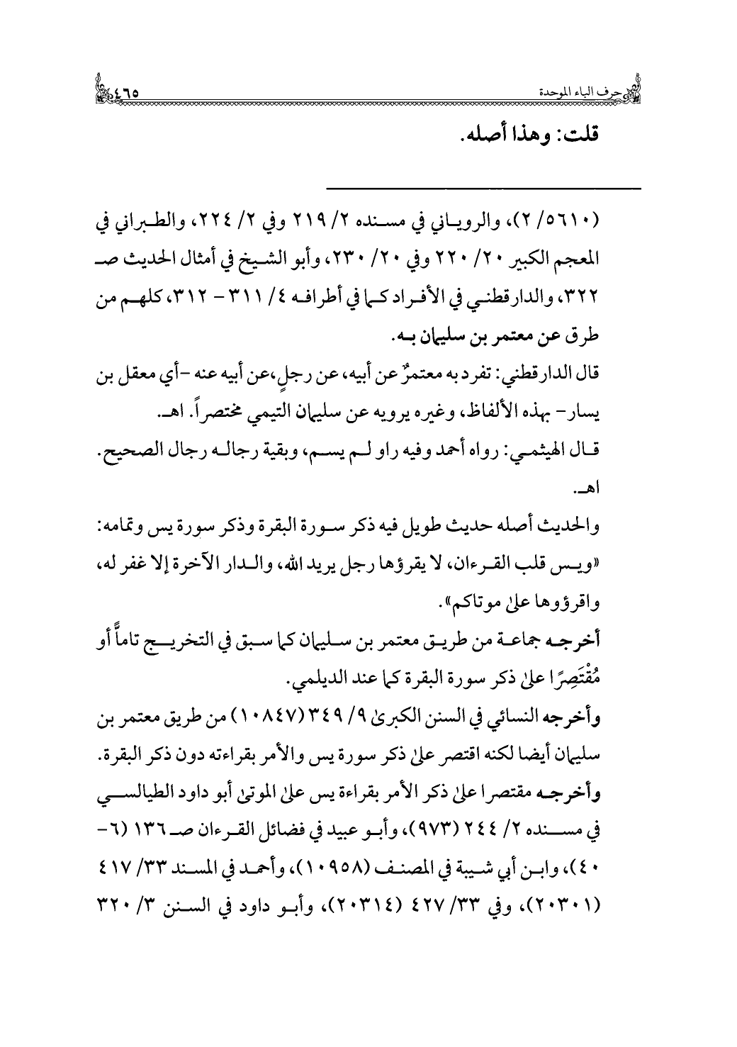 قال الدارقطني: تفرد به معتمرٌ عن أبيه، عن رجلٍ، عن أبيه عنه - أي معقل بن يسار - بهذه الألفاظ، وغيره يرويه عن سليمان التيمي مختصرًا. اهـ.