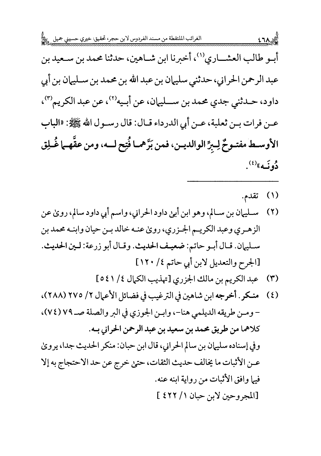 أبو طالب العشاري (¬١)، أخبرنا ابن شاهين، حدثنا محمد بن سعيد بن عبد الرحمن الحراني، حدثني سليمان بن عبد الله بن محمد بن سليمان بن أبي داود، حدثني جدي محمد بن سليمان، عن أبيه (¬٢)، عن عبد الكريم (¬٣)، عن فرات بن ثعلبة، عن أبي الدرداء قال: قال رسول الله - صلى الله عليه وسلم -: "الباب الأوسط مفتوحٌ لِبِرِّ الوالدين، فمن بَرَّهما فُتِح له، ومن عقَّهما غُلِق دُونَه" (¬٤).