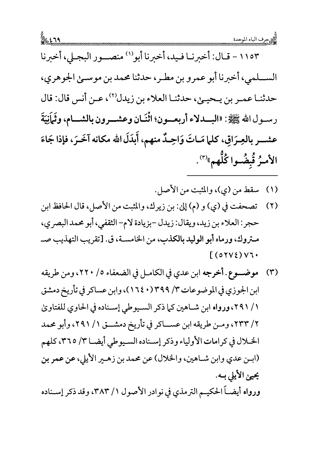 ١١٥٣ - قال: أخبرنا فيد، أخبرنا أبو (¬١) منصور البجلي، أخبرنا السلمي، أخبرنا أبو عمرو بن مطر، حدثنا محمد بن موسى الجوهري، حدثنا عمر بن يحيى، حدثنا العلاء بن زيدل (¬٢)، عن أنس قال: قال رسول الله - صلى الله عليه وسلم -: "البدلاء أربعون؛ اثْنَان وعشرون بالشام، وثَمَانِيَةَ عشر بالعِرَاقِ، كلما مَاتَ وَاحِدٌ منهم، أَبدَلَ الله مكانه آخَرَ، فإذا جَاءَ الأمرُ قُبِضُوا كُلُّهم" (¬٣).