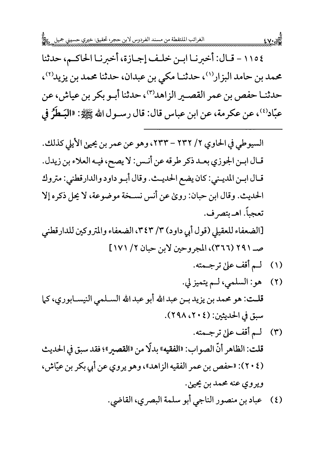 ١١٥٤ - قال: أخبرنا ابن خلف إجازة، أخبرنا الحاكم، حدثنا محمد بن حامد البزار (¬١)، حدثنا مكي بن عبدان، حدثنا محمد بن يزيد (¬٢)، حدثنا حفص بن عمر القصير الزاهد (¬٣)، حدثنا أبو بكر بن عياش، عن عبّاد (¬٤)، عن عكرمة، عن ابن عباس قال: قال رسول الله - صلى الله عليه وسلم -: "البَطَرُ في